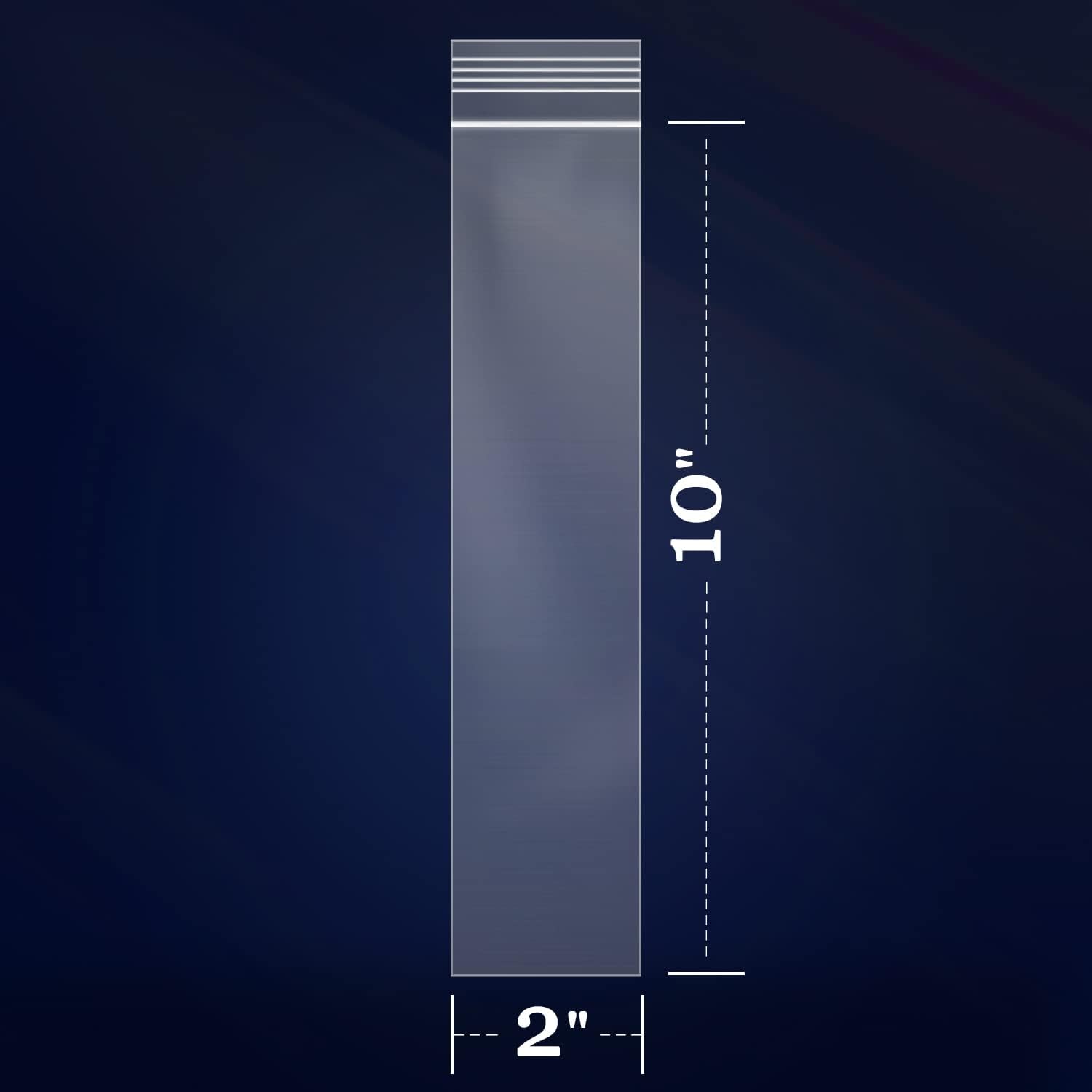 - [Specifications]: 200 PCS - 2" x 10"(Excludes Glue Flap) Resealable Zip Poly Bags - Self Sealing. 2 Mil Thickness.