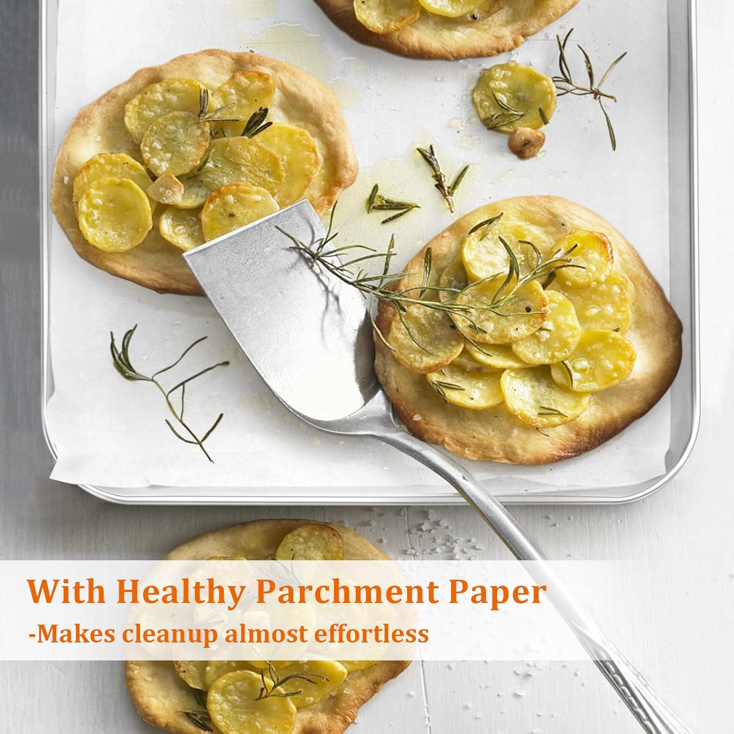- 【GREAT VALUE WITH PARCHMENT PAPER】Comes with 50pcs grease-proof/water-proof natural wood pulp parchment paper, Helps prevent sticking and easy release foods, Great for broiling and roasting anything from small layered sheet cake, pizza to vegetables, Great value to replace your old bakeware or as a gift for someone