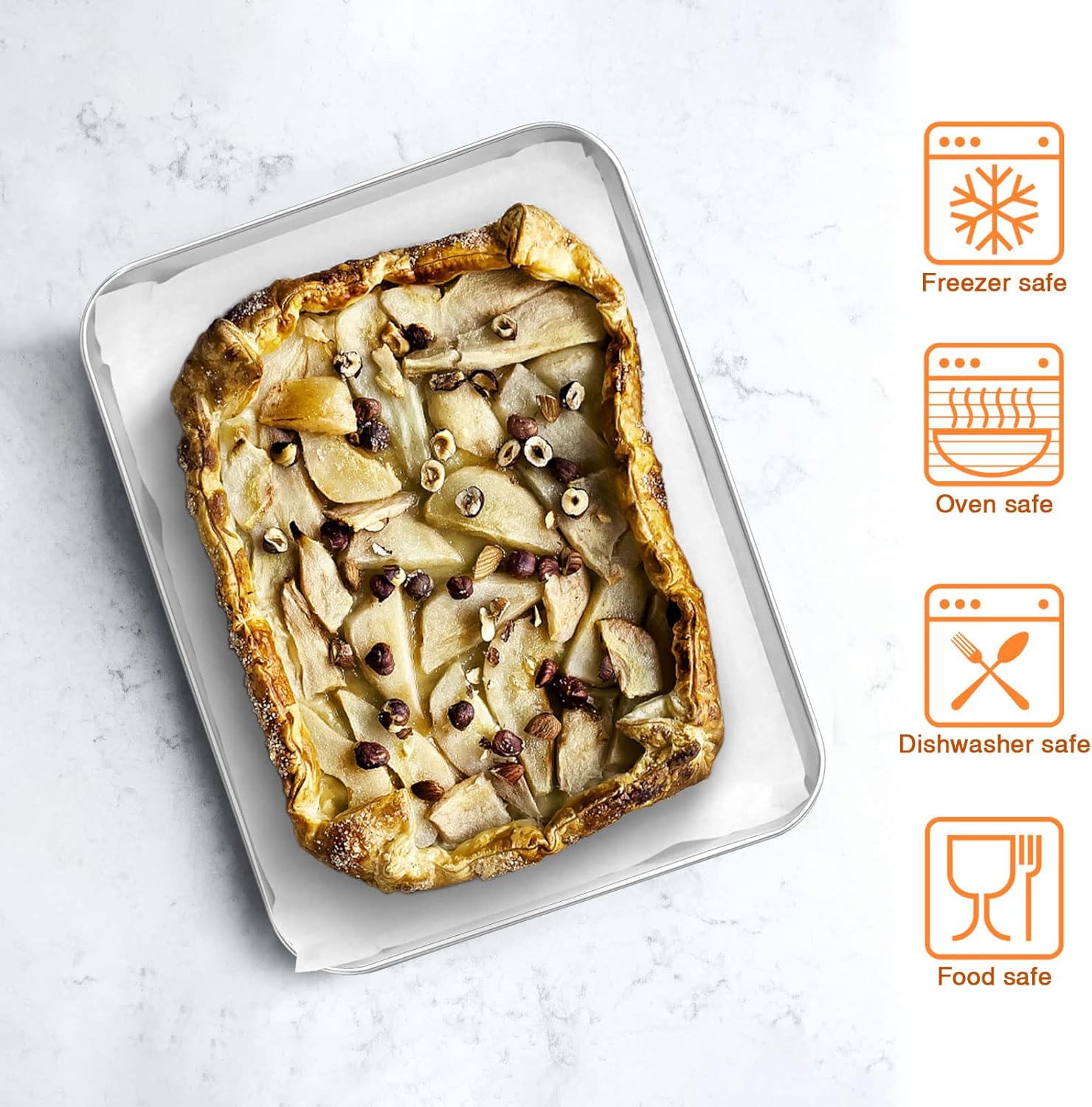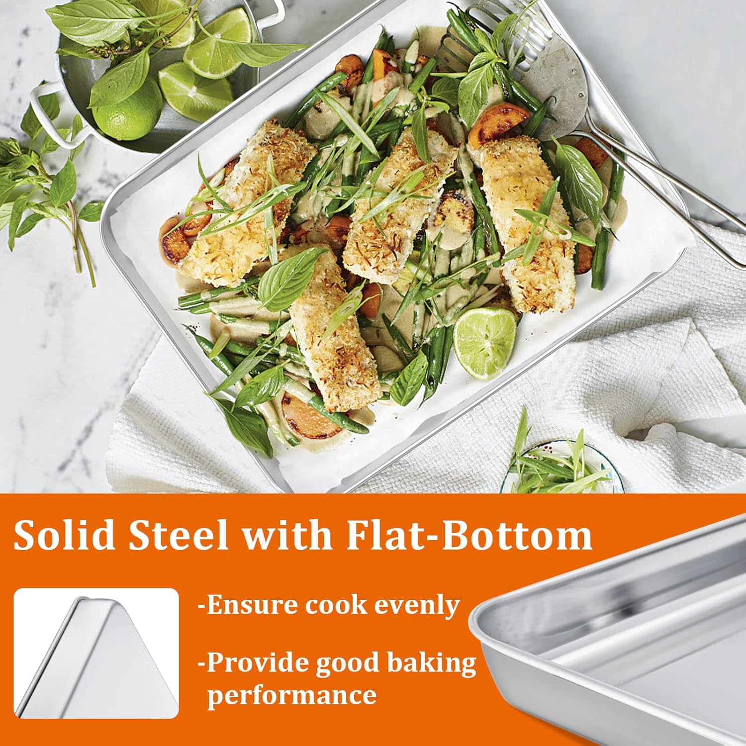 - 【HEALTHY & STURDY】Made of pure stainless steel without toxin, Ensure no harmful substances leaching on to food at high heat baking, Heavy-gauge steel stands up to the rigors of daily cooking, Better rust-proof and no easy warp, Superior to aluminum/nonstick coating pan, Durable enough to last a lifetime