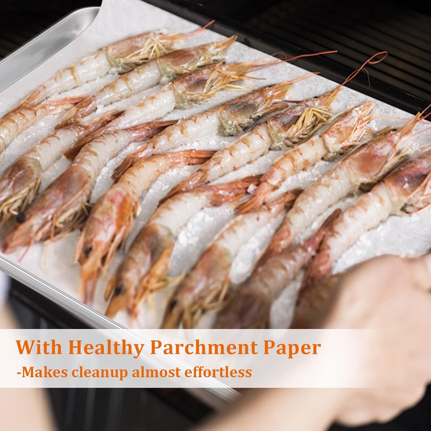 - 【GREAT VALUE WITH PARCHMENT PAPER】Comes with 50pcs grease-proof/water-proof food-grade parchment paper, No need to trim and sit perfect in the pan, Prevent sticking and easy release foods, Great for broiling and roasting anything from layered sheet cake, pizza to vegetables, Great value to replace your old bakeware