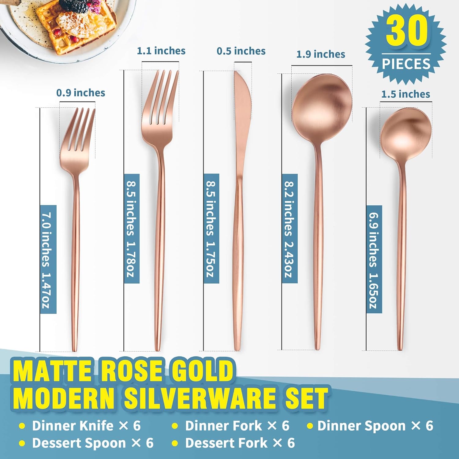 Matte Rose Gold Silverware Set for 6,Modern Stainless Steel Brushed Cutlery Set,30-Pieces Heavy Duty Flatware Set,Knives Spoons and Forks Set Utensils Set, Satin Finish, Dishwasher Safe
