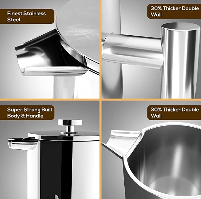 - Sleek Stainless Steel β The coffee maker is created using 304 grade stainless steel, with a smooth and durable finish and carefully designed to give you the French press you need.