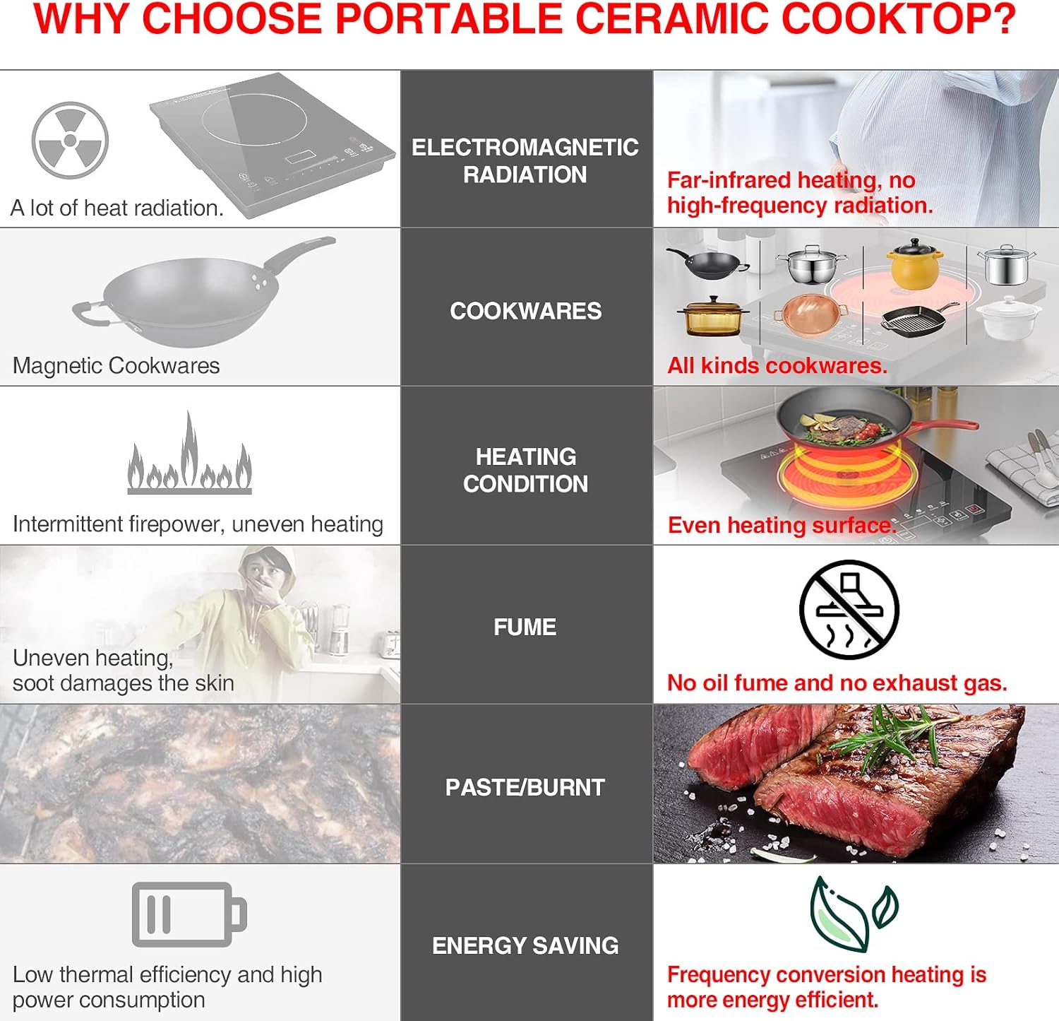 - 1800W Single Burner Electric Cooktop:This 1800W portable electric cooktop is suitable for US standard 110-120V voltage, plug and play. Ceramic electric stove without electromagnetic high-frequency radiation, better than induction cooktop,the elderly and pregnant women can use with confidence. Use ceramic electric stove cooking, no fumes, reduce the damage to the skin, to help you create a healthy kitchen environment.