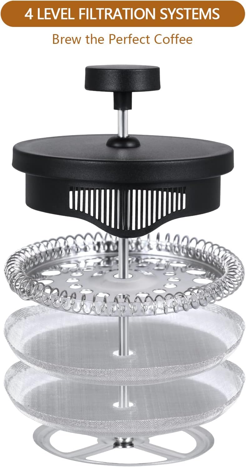 - 【4 Level Filtration Systems】 TBGENIUS French Press Coffee Maker features a 4 level filtration system to ensure that no coffee grounds get into your coffee, providing an incomparable delicious, smooth and full-flavored coffee.