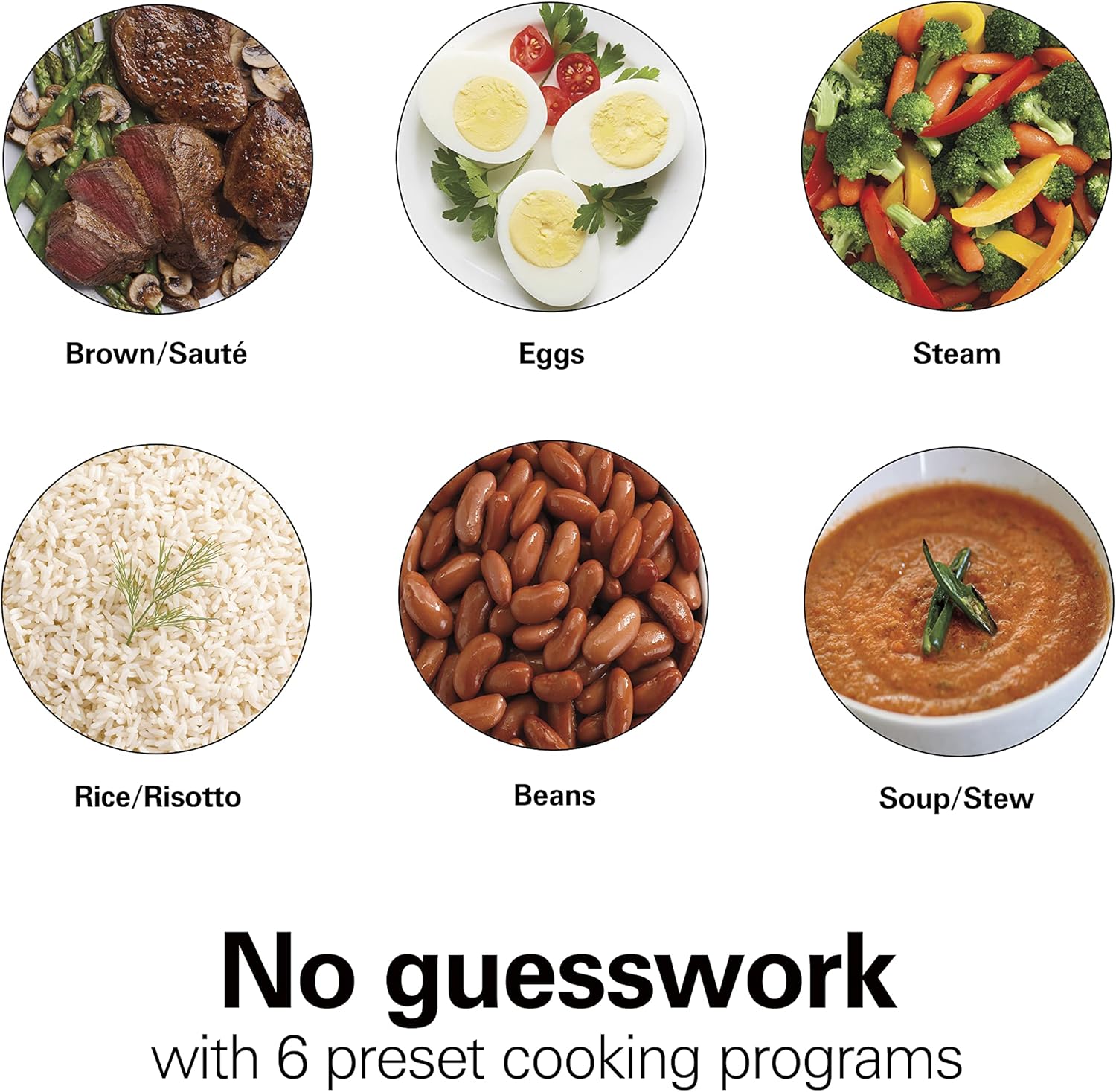 - NO GUESSWORK WITH 6 PRESET COOKING PROGRAMS. Simple one-touch controls make it easy to sauté, brown, steam, and prepare rice, grains, soups, stews and more. You'll get delicious results every time without guessing about the cooking time and temperature.