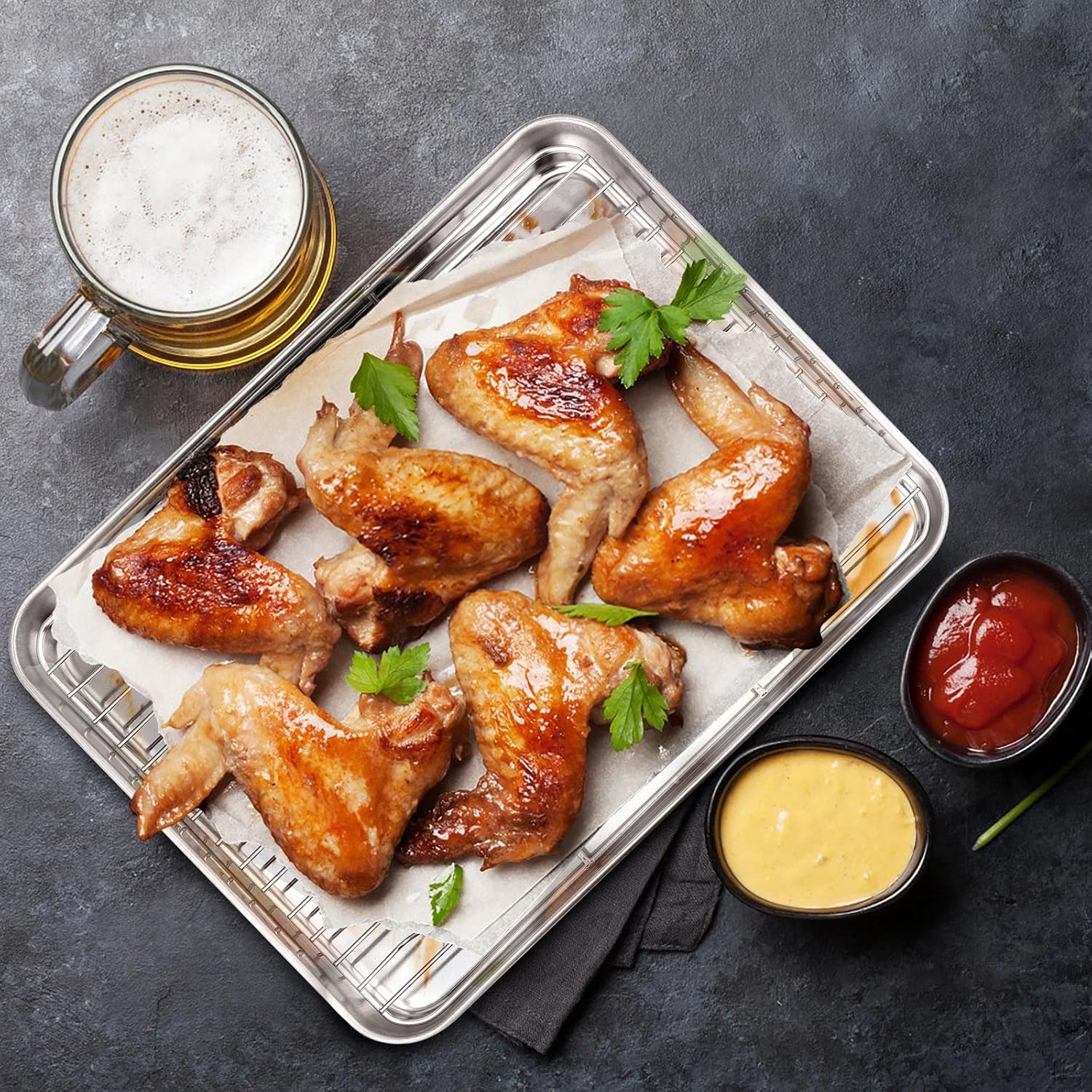 - CRAFTED PAN - Superior mirror finished surface always keep shiny, Flat baking tray with four raised rims to stop oil or juices from flowing over the edge, One-piece seamless design with round corner for easy cleanup, Smooth rolled edge without rough spots hurting your hands, Tapered sides easily stacks for storage
