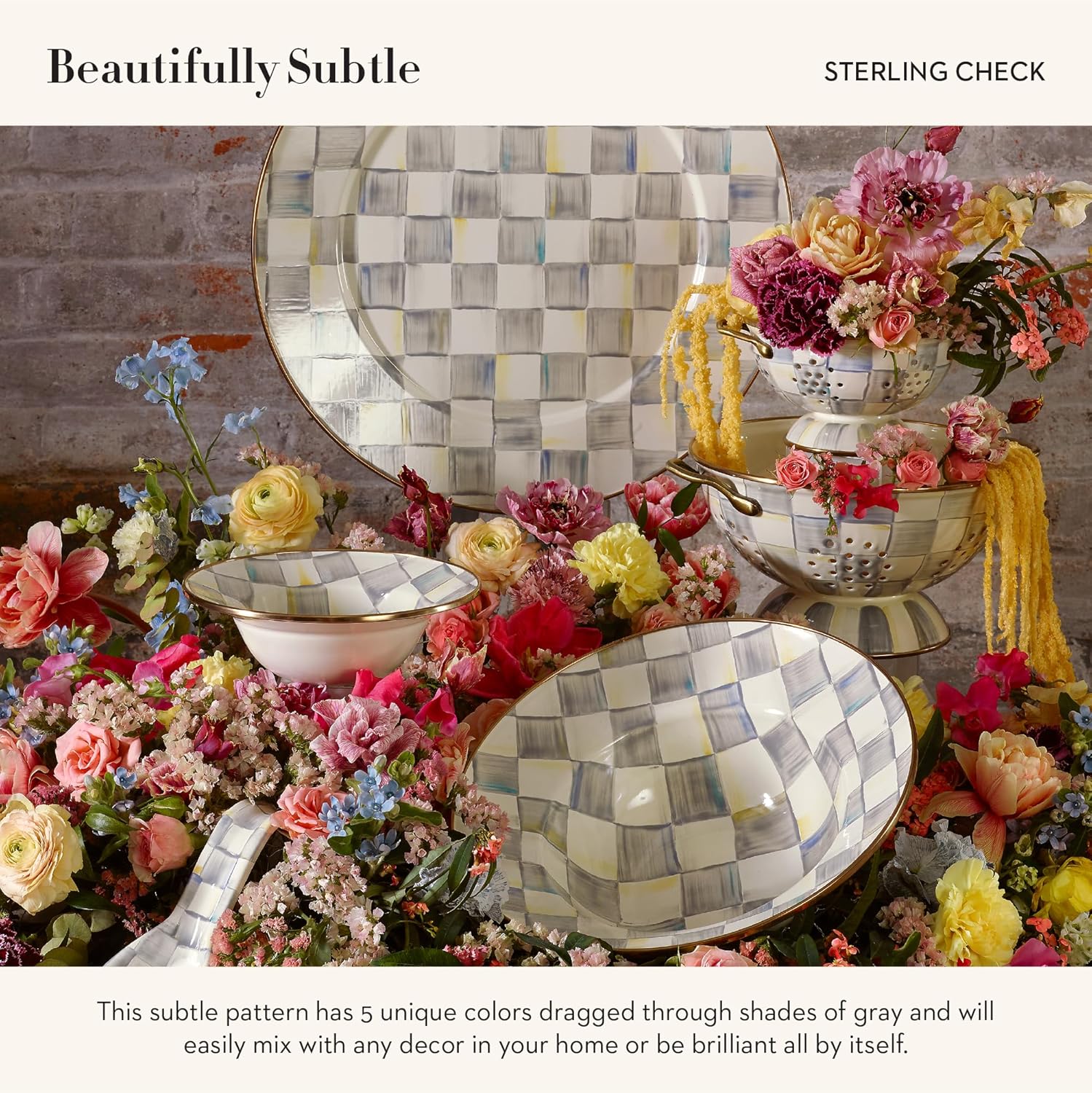 - ENTERTAINING & PARTY ESSENTIAL: The Sterling Check Enamel Serving Bowl features our subtle hand-painted gray-and-white checks over a hand-glazed steel underbody and has a bronzed stainless-steel rim.