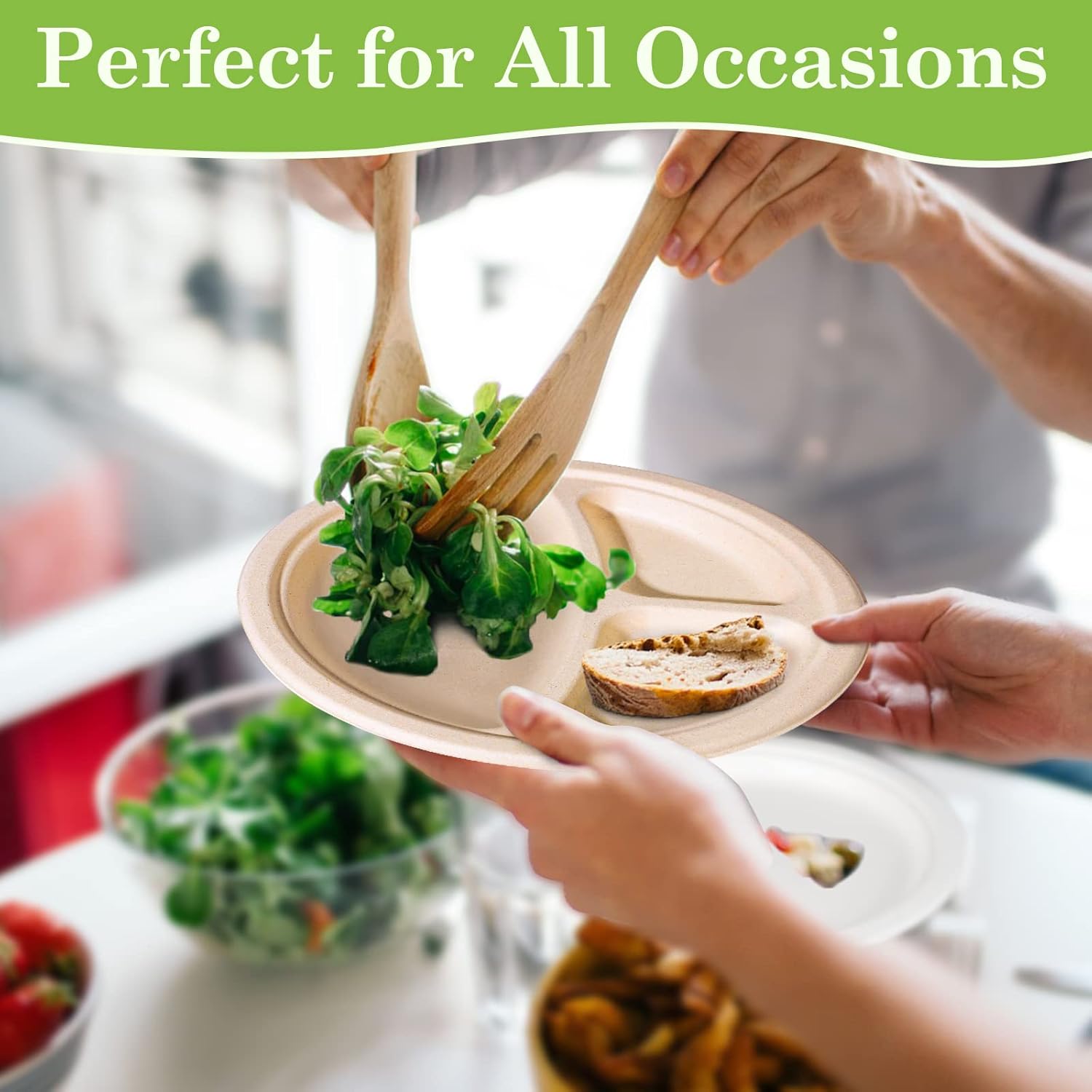 9 inch 3 Compartment Paper Plates - 50 Pack, Heavy Duty, Divided, Compostable