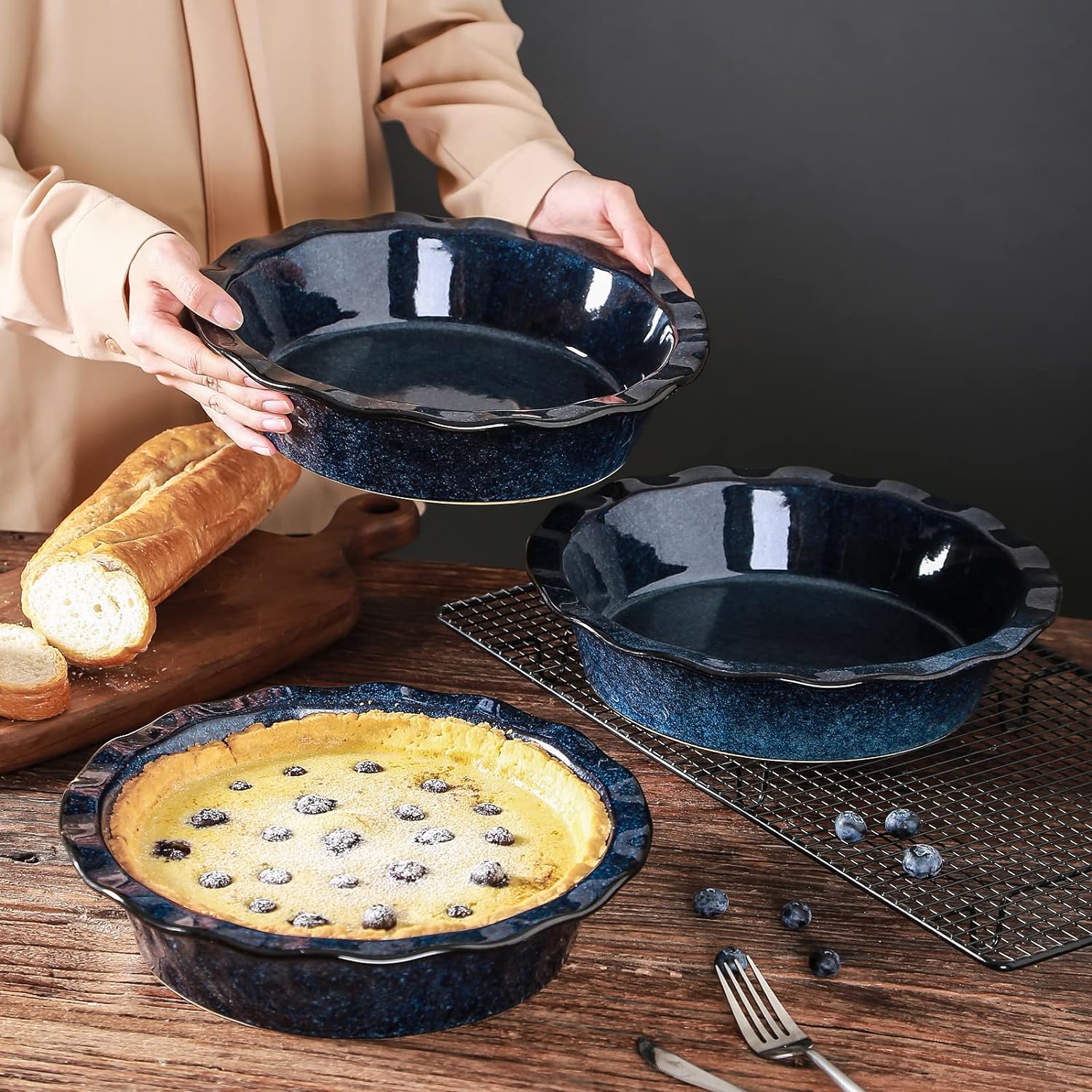 vicrays Ceramic Pie Pan for Baking - 9 inch Pie Plate, Round, Fluted and Deep Pie Dish for Tart, Pizza, Apple Pie, Quiche, Pot Pies, Cake - Reactive Glaze (Starry Blue)