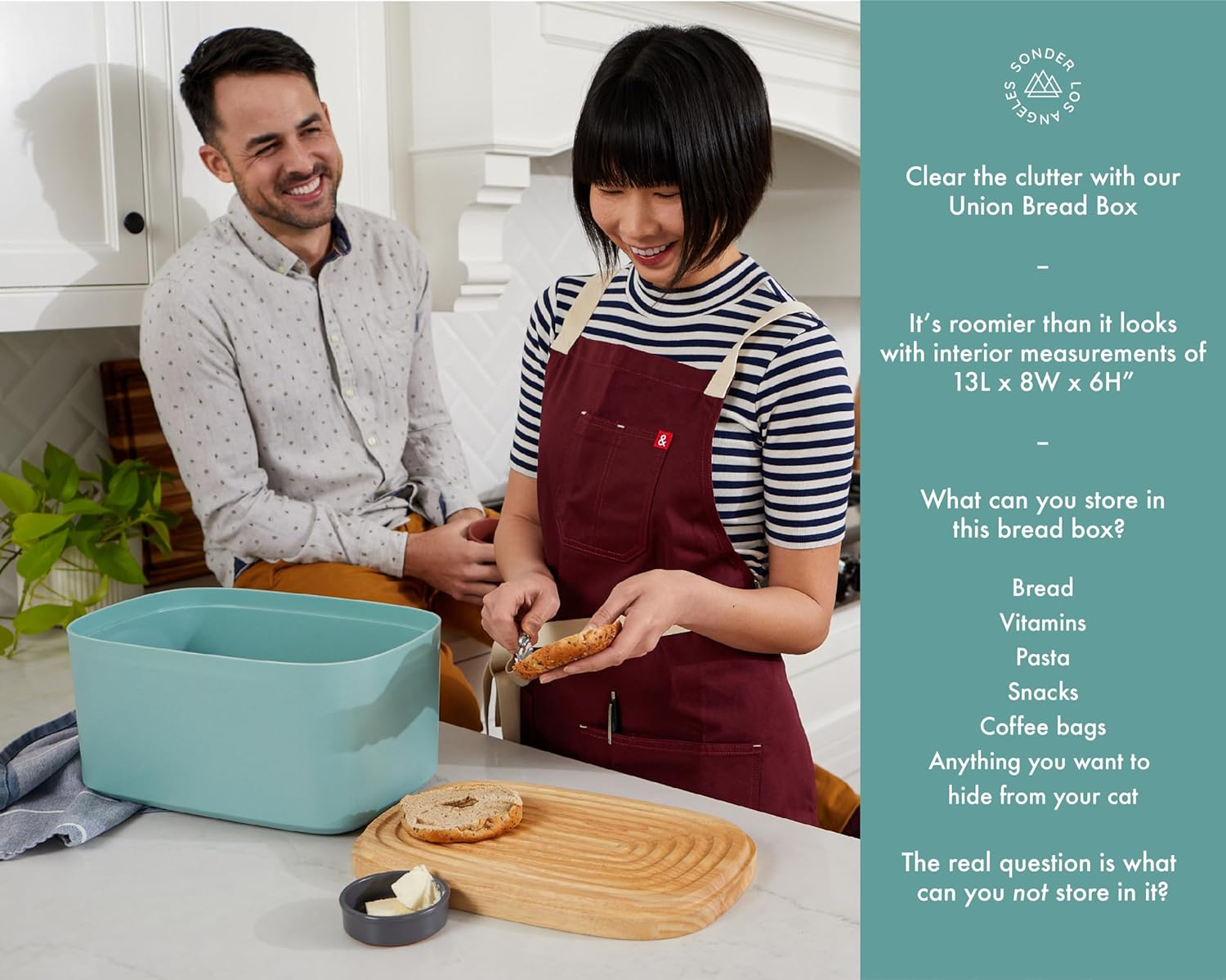 Sonder Los Angeles, Modern Bamboo Fiber and Recycled Plastic Bread Box (Blue Green) for Kitchen Countertop with Reversible Bread Board Wood Lid 14.25 x 9.25 x 7 in