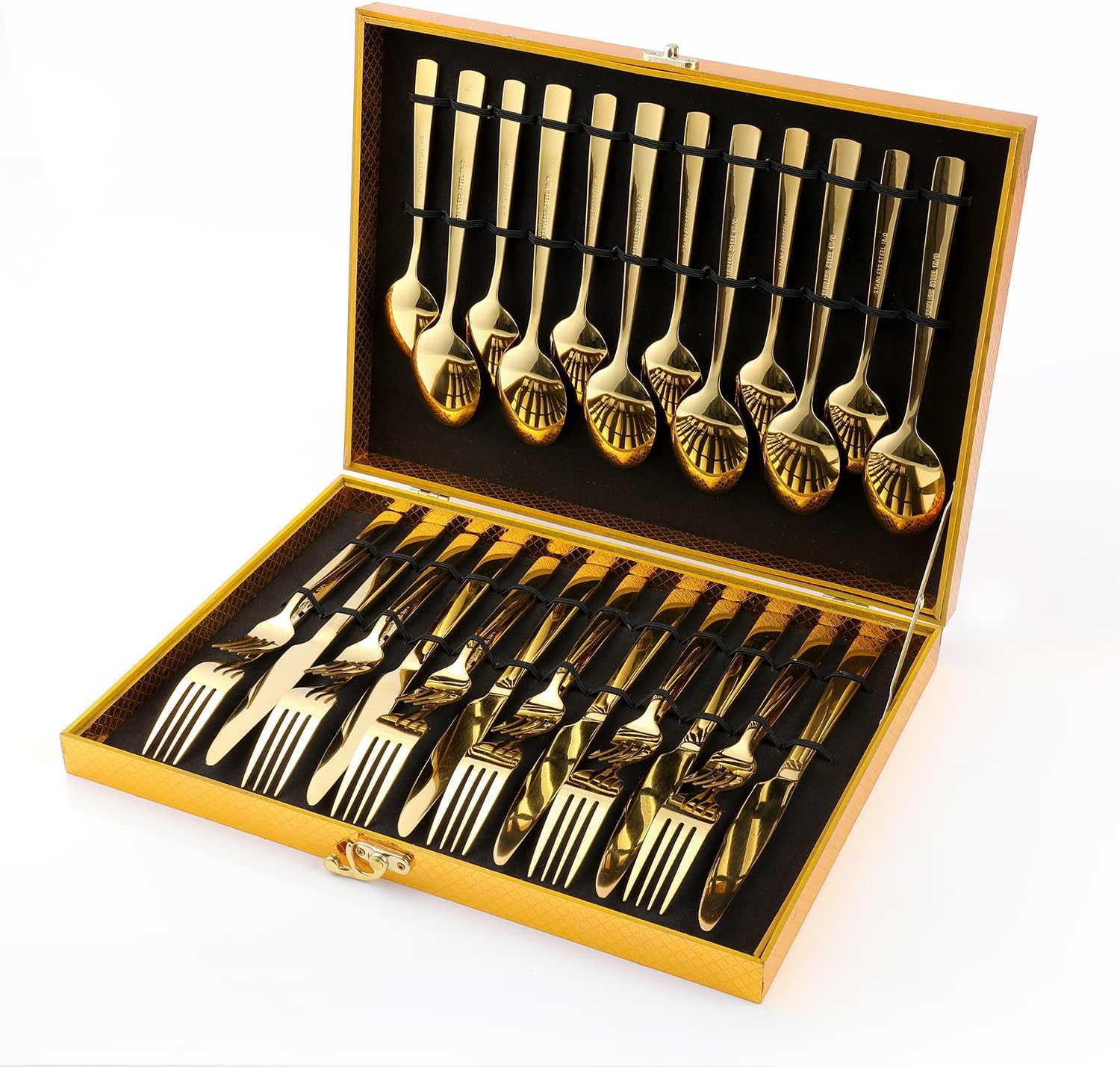 - 【FOOD-GRADE 18/8 STAINLESS STEEL】: The gold flatware set is made of 18/8 stainless steel which is durable and corrosion-resistant, rust-proof, non-toxic, BPA-free, healthy for your daily use. At the same time, good sturdiness ensures that it will not bend easily and always maintain a beautiful appearance.