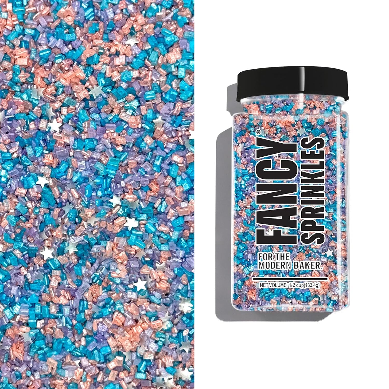 Fancy Sprinkles Opal Rain Fancy Sugar Pearlescent Peach, Lavender, and Pale Blue Sugar Crystals Flecked Silver Mini Edible Glitter Stars (4 OZ)