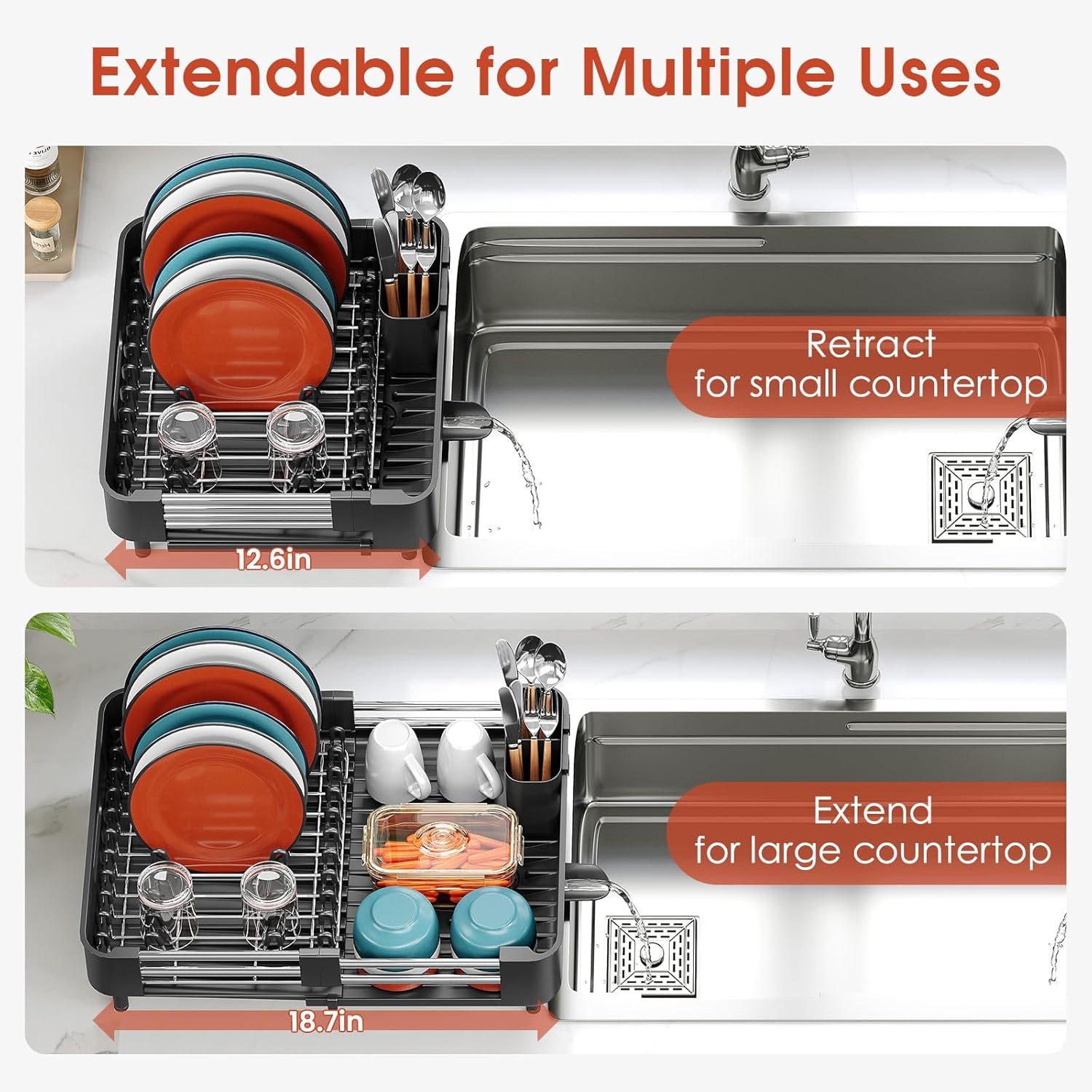 Dish Drying Rack for Kitchen Counter, Extendable Dish Rack with Drainboard, Expandable Dish Drainer, Collapsible Dish Strainer with Cutlery Holder, Foldable Home Countertop Plate Storage Rack, Black