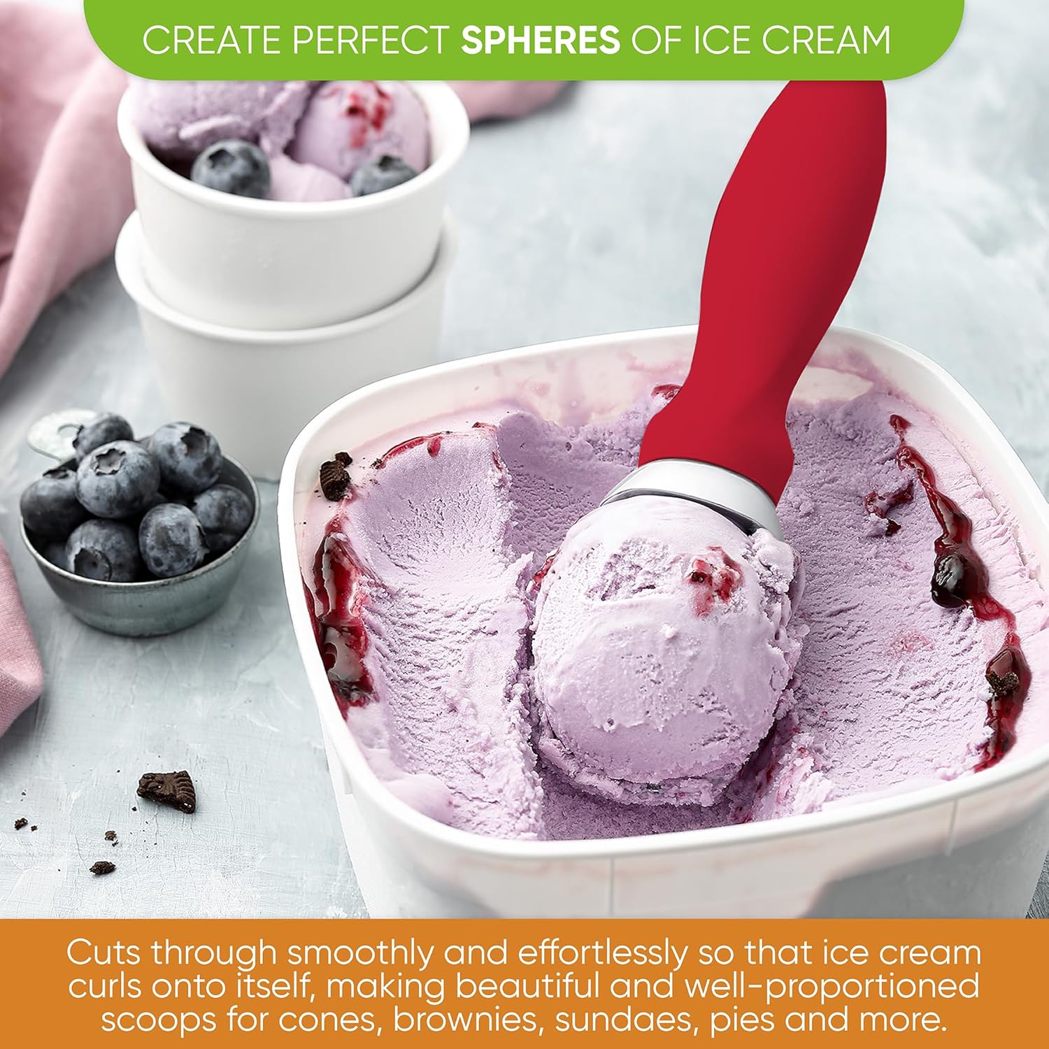 - Create Perfect Spheres Of Ice Cream (2 Pack) - Cuts through smoothly and effortlessly so that ice cream curls onto itself, making beautiful and well-proportioned scoops for cones, brownies, sundaes, pies and more. You'll receive 2 scoops so you can enjoy 2 different flavors at the same time.