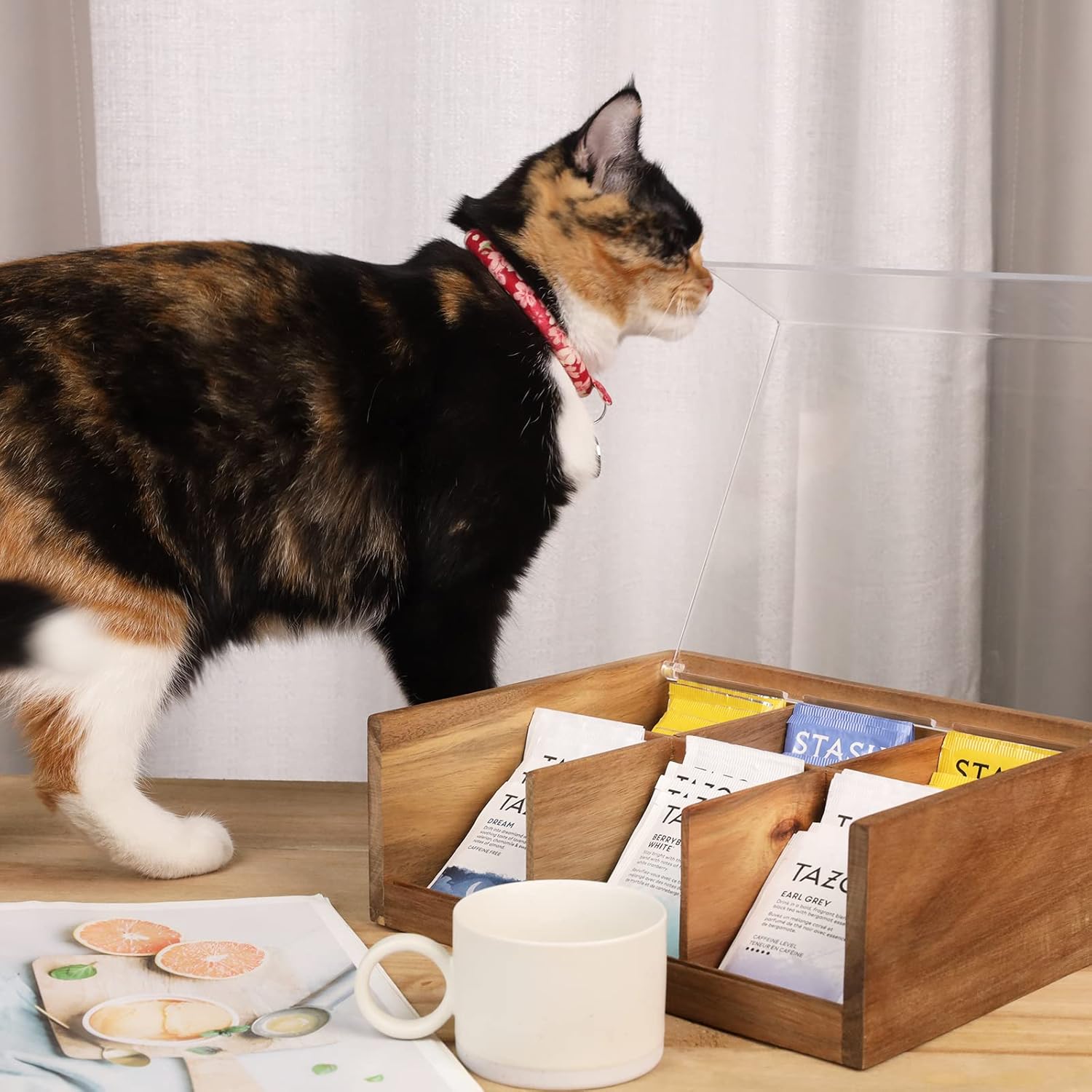 Tea Bag Organizer 6 Compartments by HTB| Gift Box Acacia Wood Tea Organizer for Tea Bags with Acrylic Transparent Hinged Lid