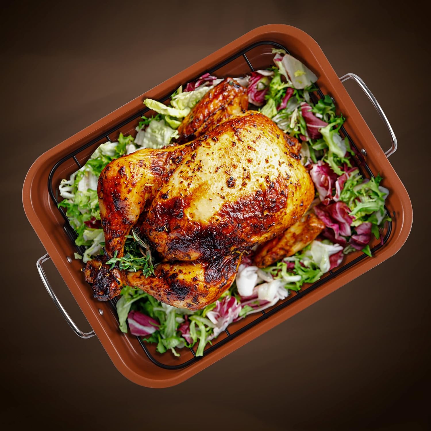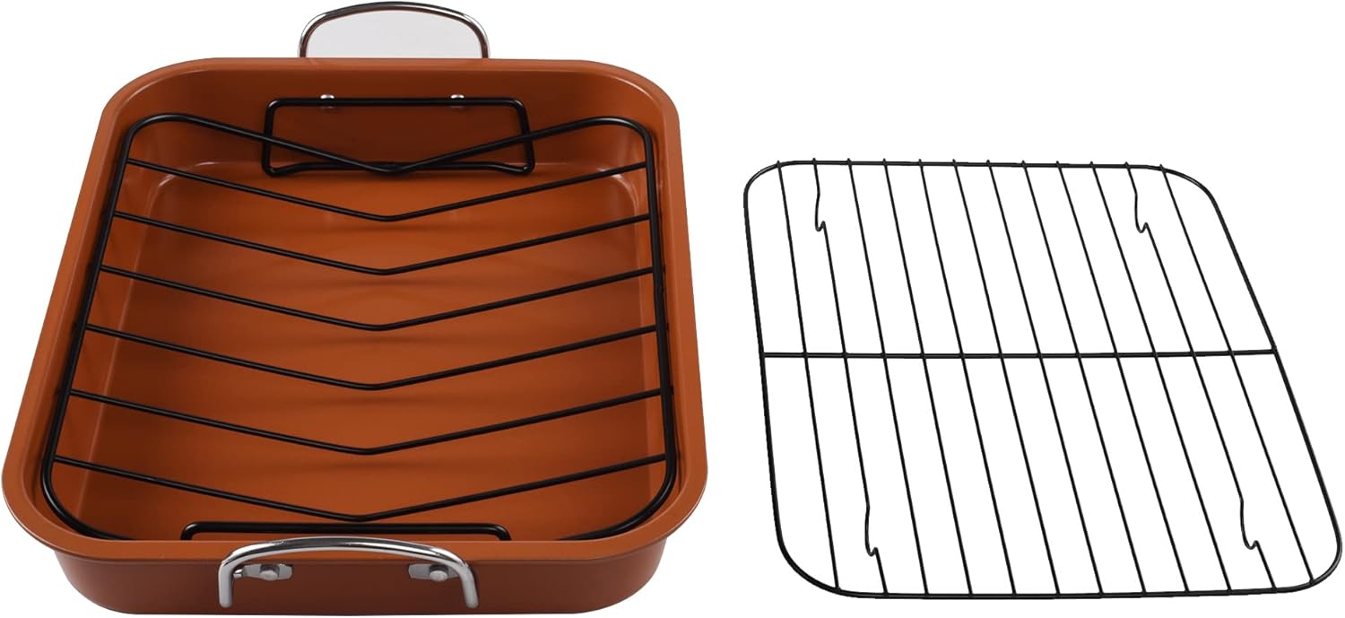 - SUPERIOR ROASTING PAN CONSTRUCTION: Heavy-duty steel construction promotes even heat distribution, roasting pan is oven safe to 450 degrees F; Superior nonstick technology provides excellent food release and easy cleanup.