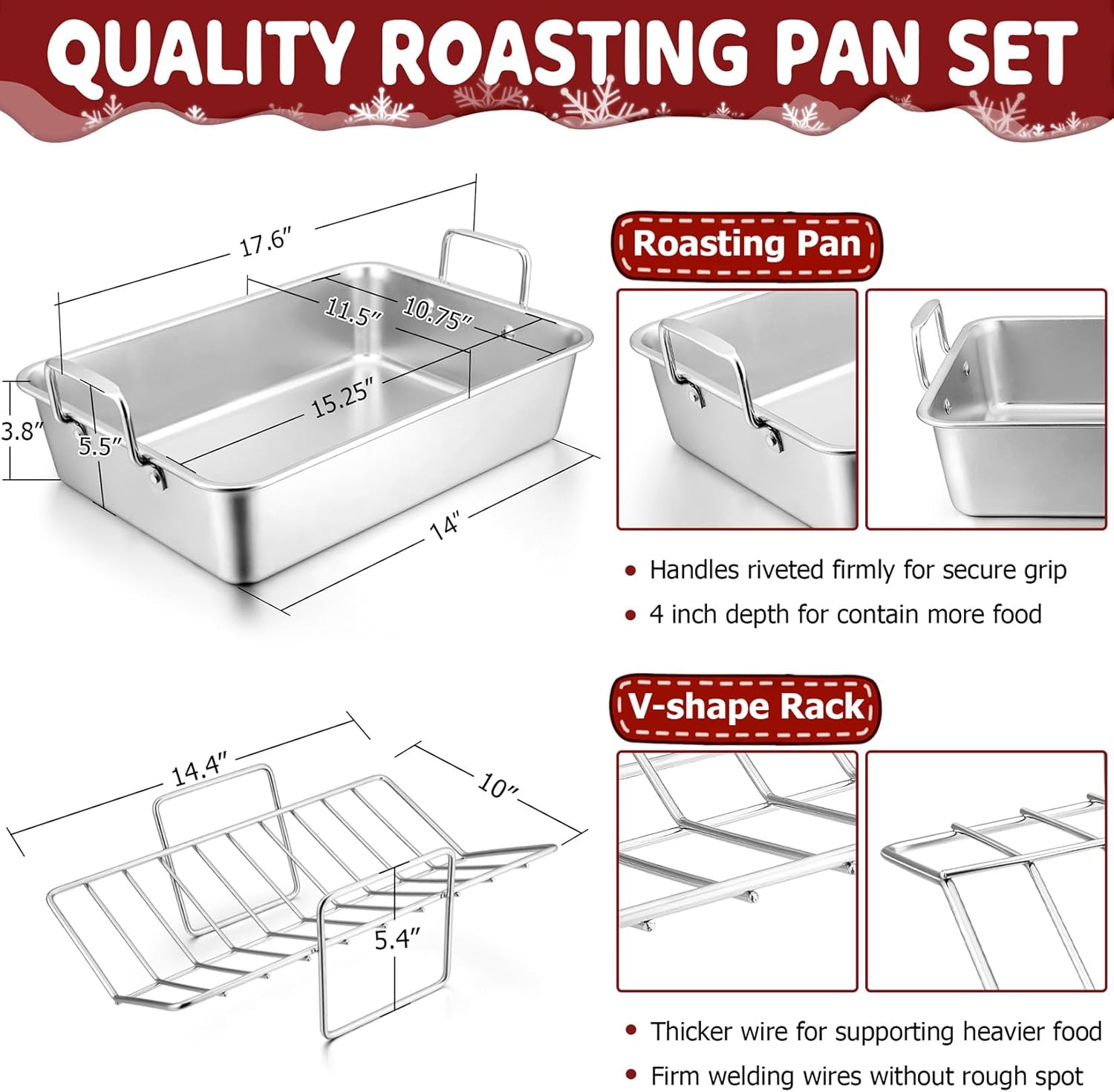 - 【VERSATILE SET】 This roasting pan with rack set is fit in all types of convection ovens, Ideal for roasting turkey/ ham/ rib/ chicken/ lamb/ fish/ casserole, Baking brownie/ lasagna/ bread and more, Helps prepare everyday cooking and dinner parties efficiently, Be a nice choice as a gift for your family and friends on Thanksgiving, Christmas, Housewarming and Wedding