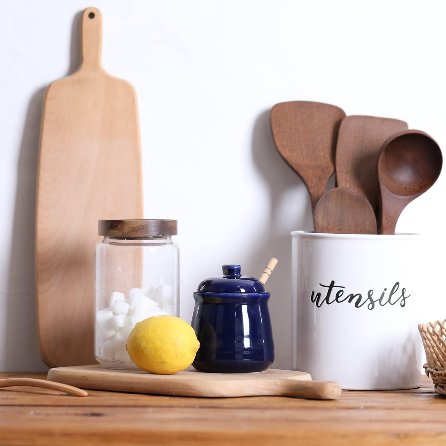 LEETOYI Porcelain Honey Jar with Lid and Dipper,Ceramic Honey pot,12oz (Navy)