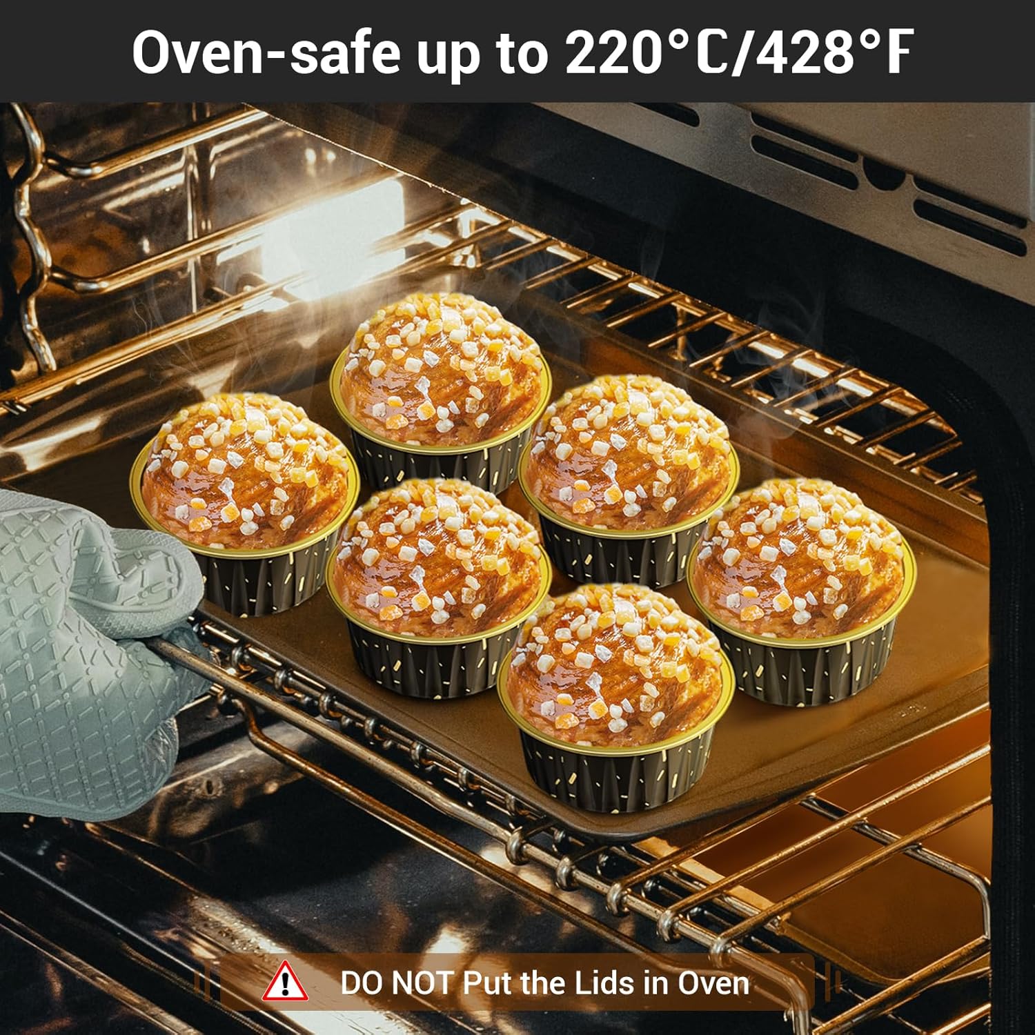 EUSOAR Foil Ramekins with Lids, Black 60Packs 5oz Disposable Baking Cups Foil Liner Cupcake Container, Dessert Cheesecake Pan Creme Brulee Cupcake Containers for Catering Gathering Club Wedding Party