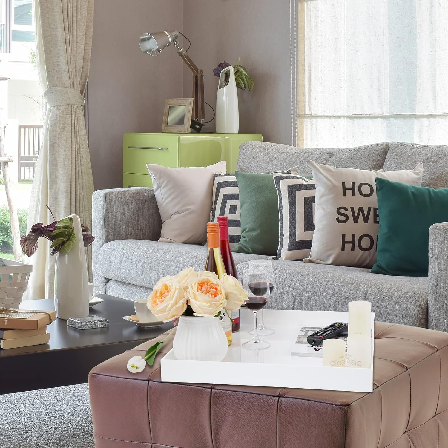 18×18 Inches Glossy White Acrylic Serving Tray with Handles Extra Large Ottoman Tray Decorative Trays Spill-Proof Coffee Table Space Saver Oversize Counter top Organizer Platter with Safe Edge