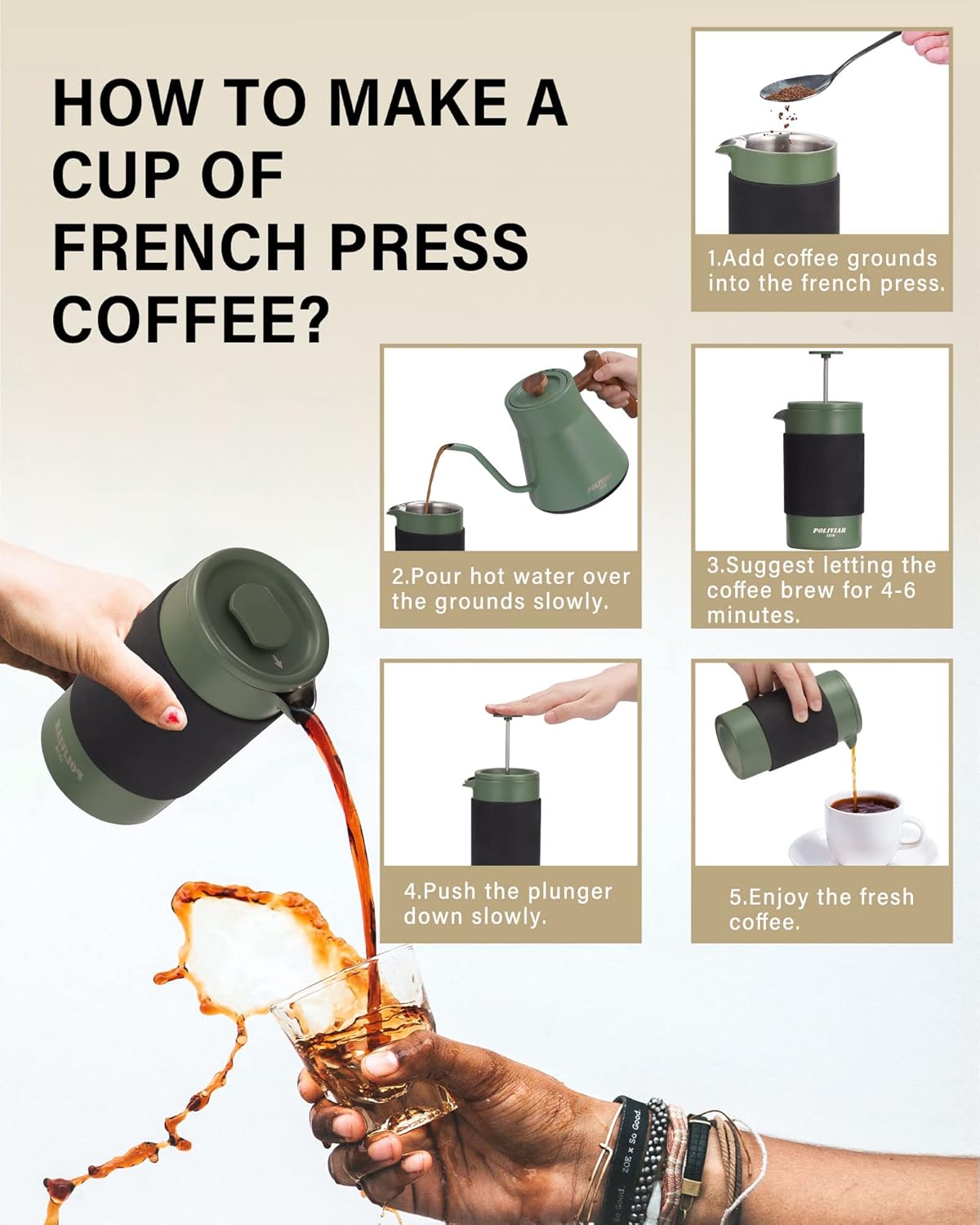 - BREW FRESH COFFEE ANYTIME AND ANYWHERE - Different form normal portable french press, POLIVIAR french press comes with a coffee grounds canister and an exquisite collection bag that it is light and convenient for coffee lover to carry out. The 12 oz capacity is perfect for 1 cup coffee that user can brew rich and fresh coffee anytime and anywhere they want.