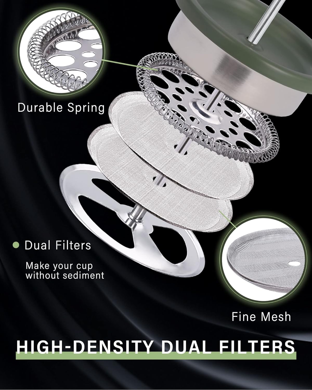 - DOUBLE WALL VACUUM INSULATION AND DUAL FILTERS - The double wall design of the french press coffee maker keeps coffee hot and the high-density dual filters structure can separate grounds from coffee perfectly, helping to make your cup without sediment and increase the smoothness of the brew. And the filters can be took apart easily for cleaning.