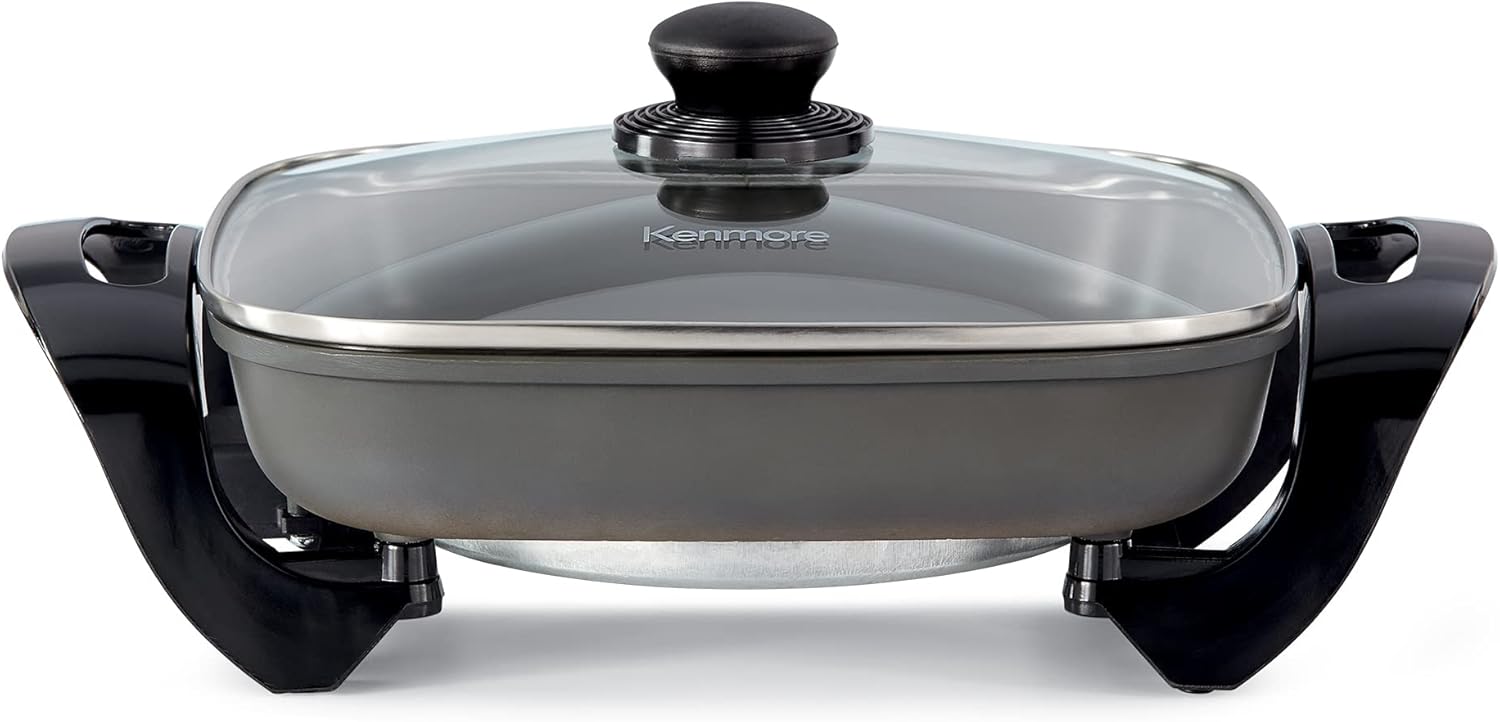 - VERSATILE ONE-POT COOKING - With high sides and a vented glass lid, the Kenmore Electric Skillet can be used to cook everything from pancakes to stews. The cool touch handles let you safely transport it from counter to table, making it a versatile one-pot wonder for various cooking needs. This feature is appreciated by users who enjoy cooking a wide range of dishes.
