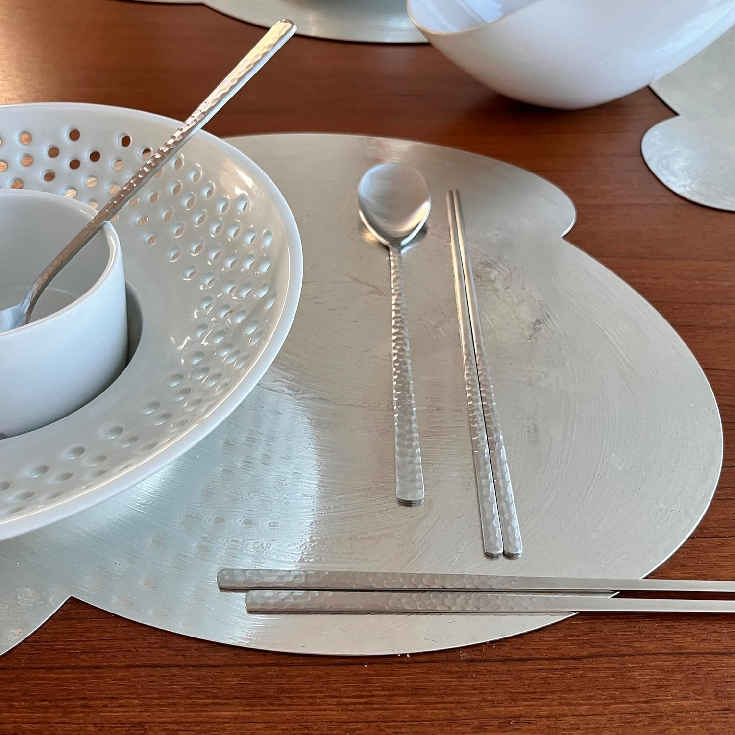 - 【LUMINOUS SILVER WITH UNIQUE TEXTURE】Embossed texture on the handle side of the spoon and chopsticks shine everywhere you see. This is unique design feature and the value never fade off. The embossed texture also helps for the better grip and nonslip while you use it. Stocking stoffer gift for mom as well as gift for dad.