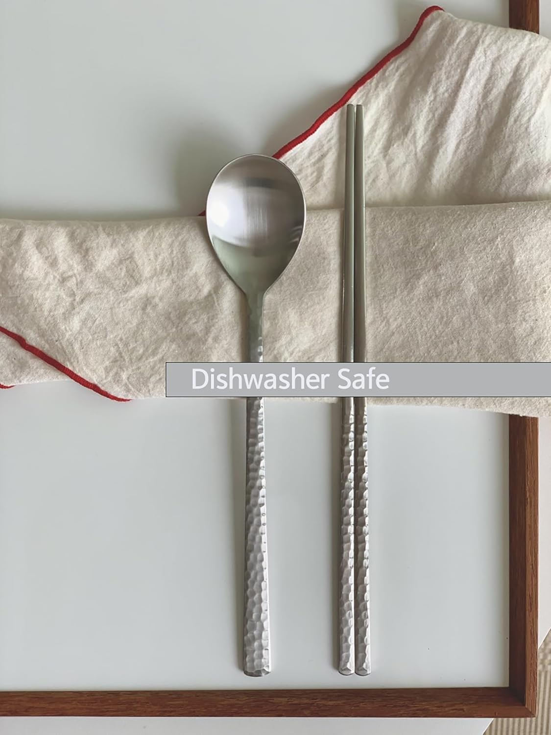- 【QUALITY KOREAN MADE】Our spoon and chopsticks are quality made in Korea. It made of top food grade 18/10 stainless steel, providing durability will last you many years. Their edges have been polished many times and are smooth that they won't scratch your mouth. They are resistant to rust, corrosion and dishwasher safe. It's a great alternative to the plastic spoons. gift for mom as well as gift for dad.