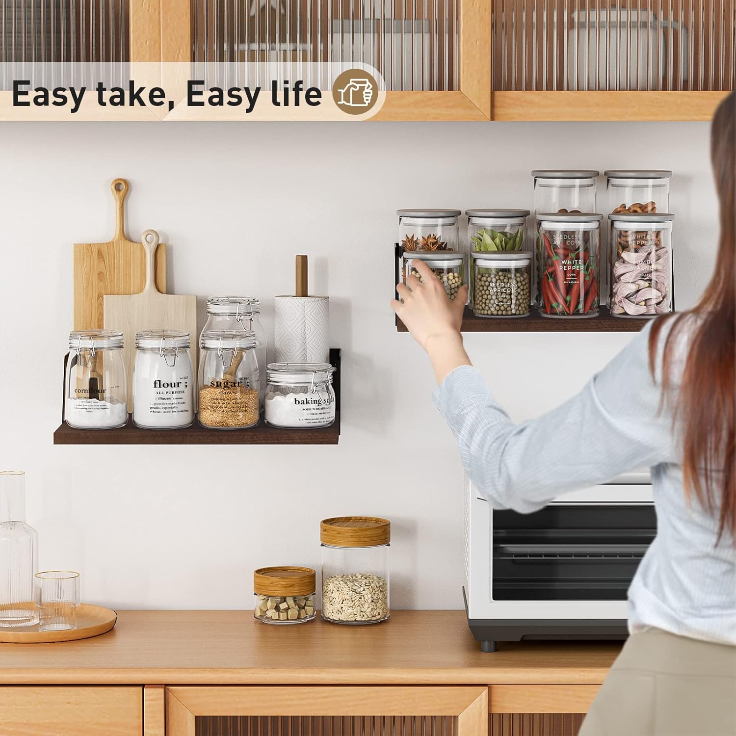 - Functional Wall Shelves: Versatile wood shelves allow you to exhibit photos or plants in the living room, hold beauty products in the bathroom , or hold spices and jars in the kitchen.