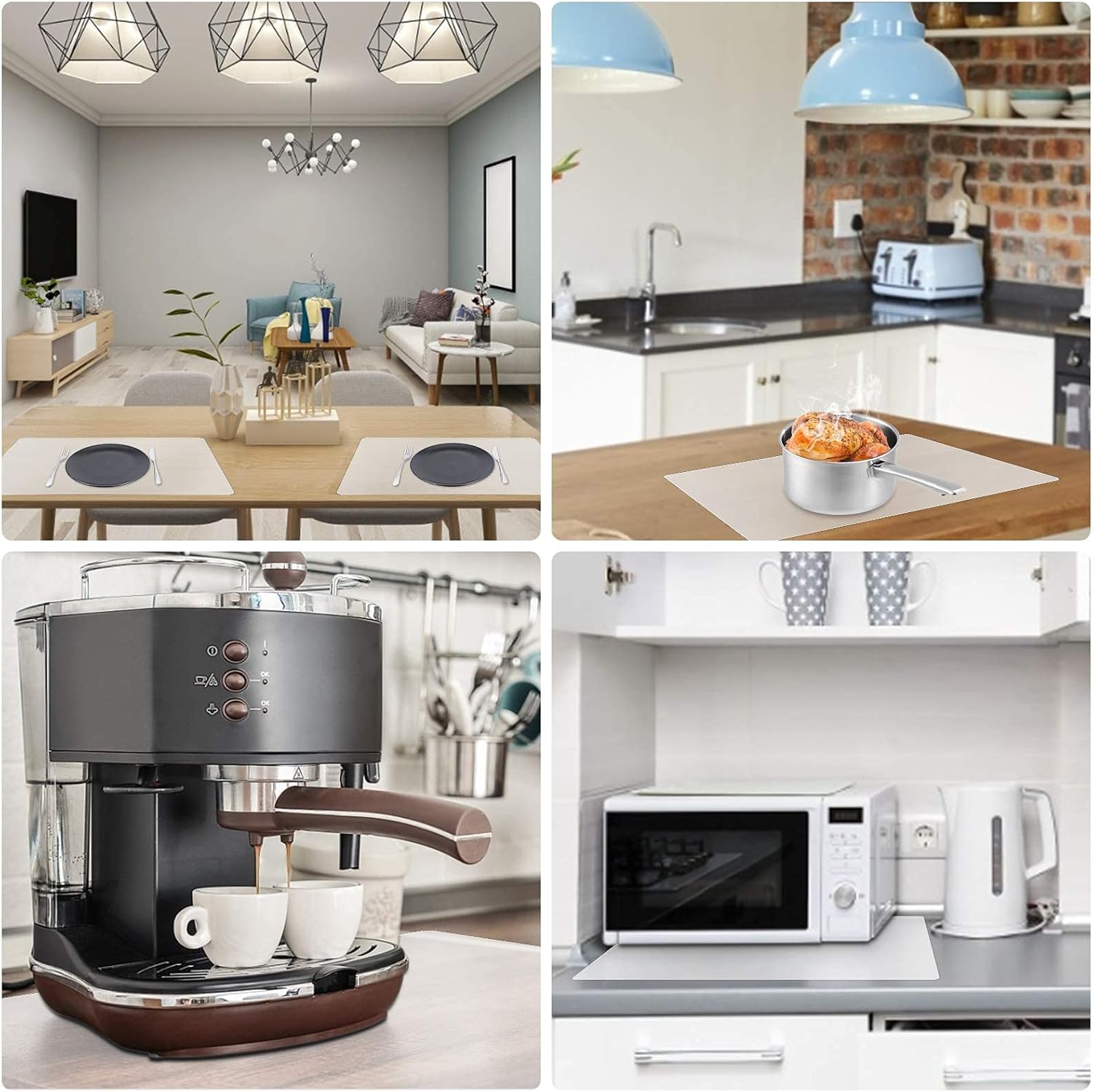 - Countertop Protector : The multipurpose silicone mat can be used as placemats, pot holder, dish mats, tableware, trivet, drains, heat insulated pads to protect the kitchen countertops and other surfaces against spills, scratches, grease, heat, etc.