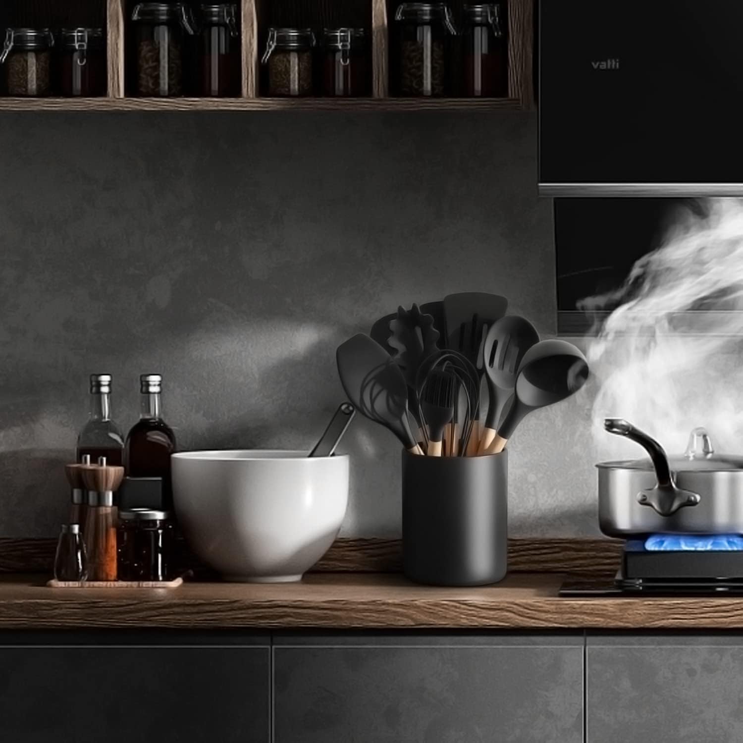 - [ Multifunctional utensil jar ] Matte black utensil holder for countertop suitable for small and medium cookware, keeping cutlery at your fingertips. Black utensil holder for kitchen counter can also be used as an ornament to store and decorate kitchen accessories