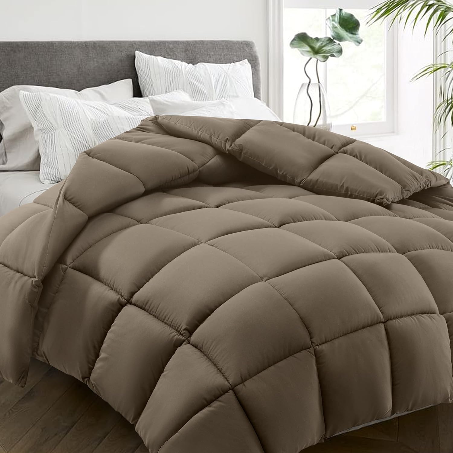 HYLEORY All Season Twin Size Bed Comforter - Cooling Down Alternative Quilted Duvet Insert with Corner Tabs - Winter Warm - Machine Washable - Taupe