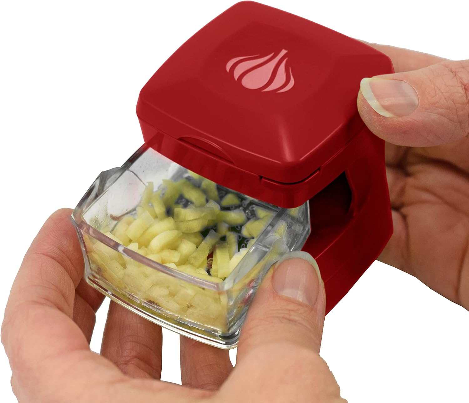Garlic-A-Peel Garlic Press, Crusher, Cutter, Mincer, and Storage Container - Includes Silicone Garlic Peeler - Easy to Clean - Stainless Steel Blades – (Red), standard