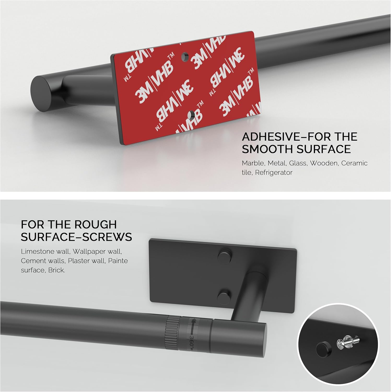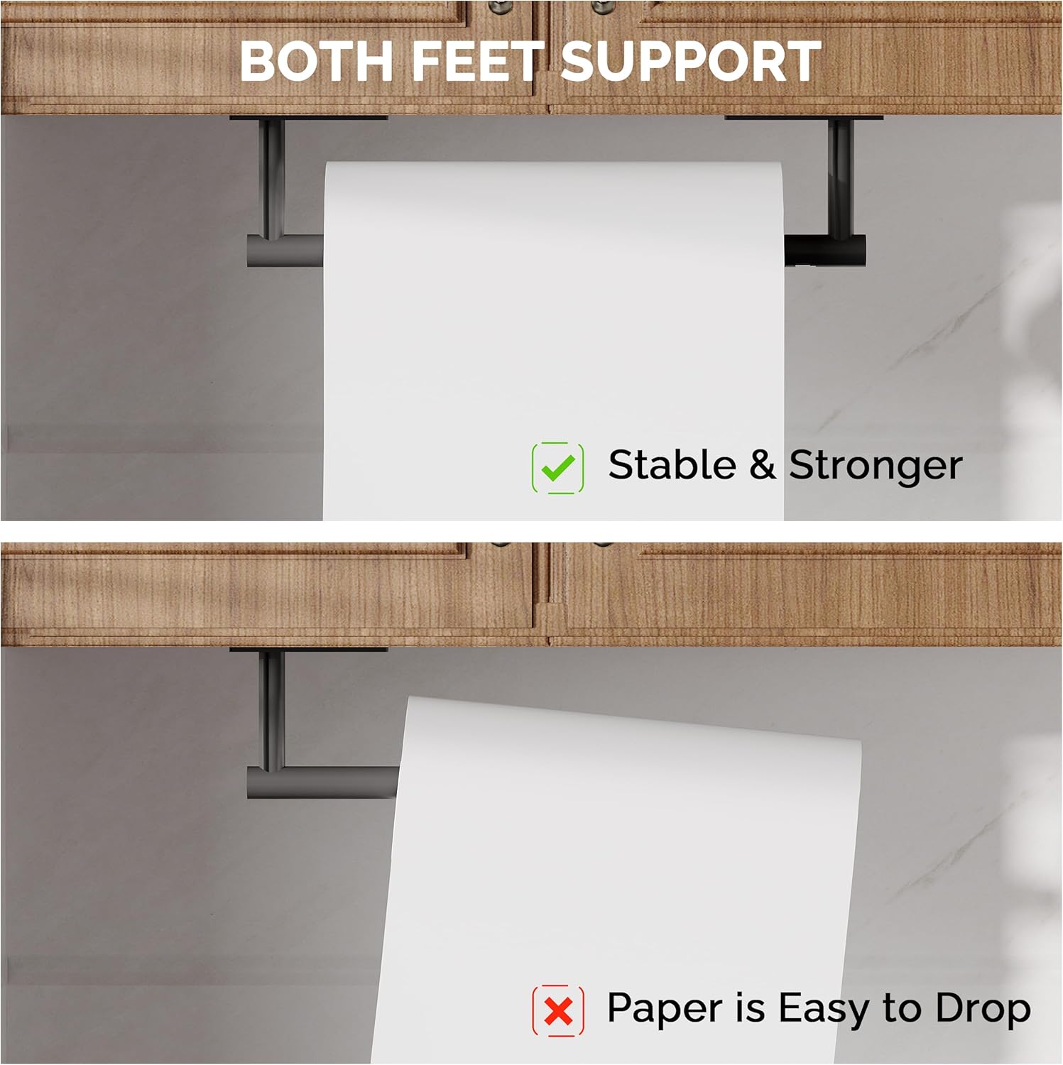 - [Two Installtion Methods] This paper towel holder under cabinet has two installation methods: pasting and punching. Adhesive ensures kitchen towel holder adhere firmly to the wall (pressing firmly on the desired area for more than 30 seconds, waiting for 24 hours for greater adhesive effect). We also provide wall mounted accessories. This kit includes all the necessary installation equipment