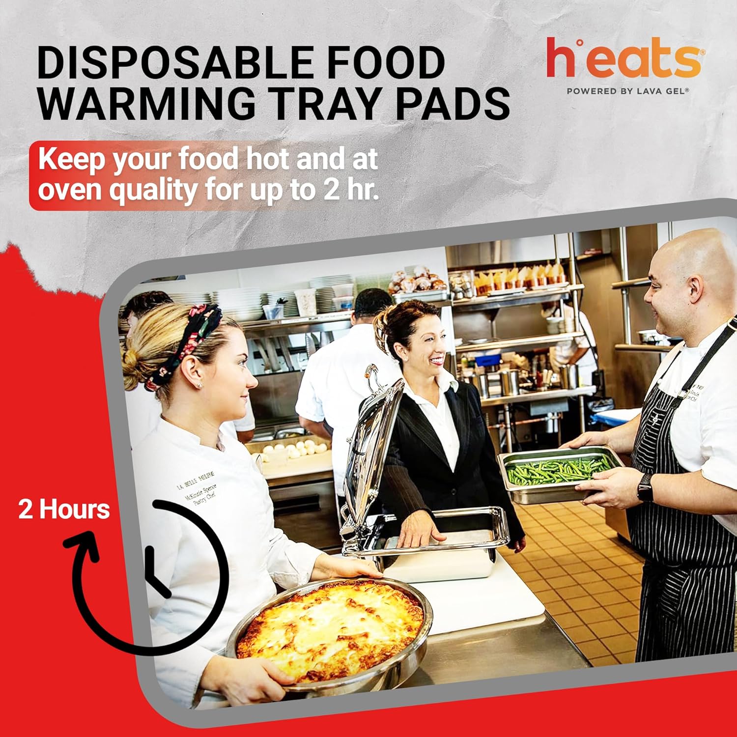 - Q: Can the h°eats pad replace traditional heating methods like gel alcohol cans? A: Yes! The h°eats pad is a flameless, water-activated alternative to gel alcohol cans and other open-flame methods. It’s safer, disposable, and easy to use, making it ideal for catering, food delivery, and off-site events—without the mess or fire risk.