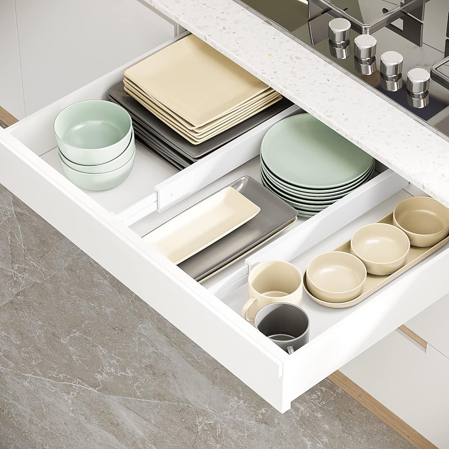 - MULTIPUL USED FOR ORGANIZATION: You can use BAMEOS drawer dividers in any drawers of your bedroom, office, kitchen, living room and garage; It can keep your drawer neat and organized all the time