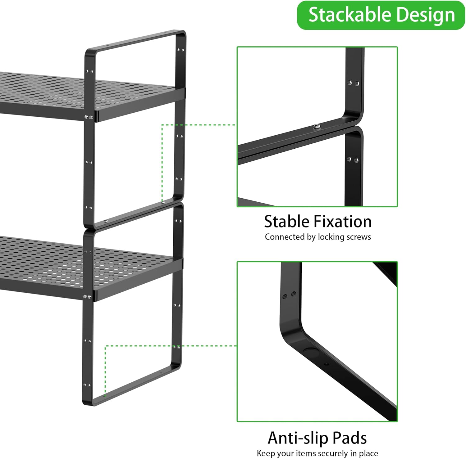 Expandable Cabinet Storage Shelf Stackable Organizer Rack for Kitchen Bathroom Pantry Spice Cupboard Coffee Countertop Home Office Desk Heavy Duty Nonslip Black Large 2 Packs
