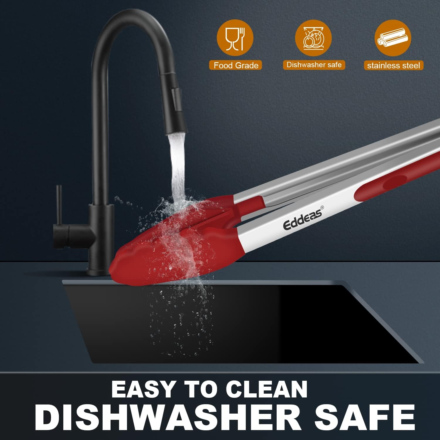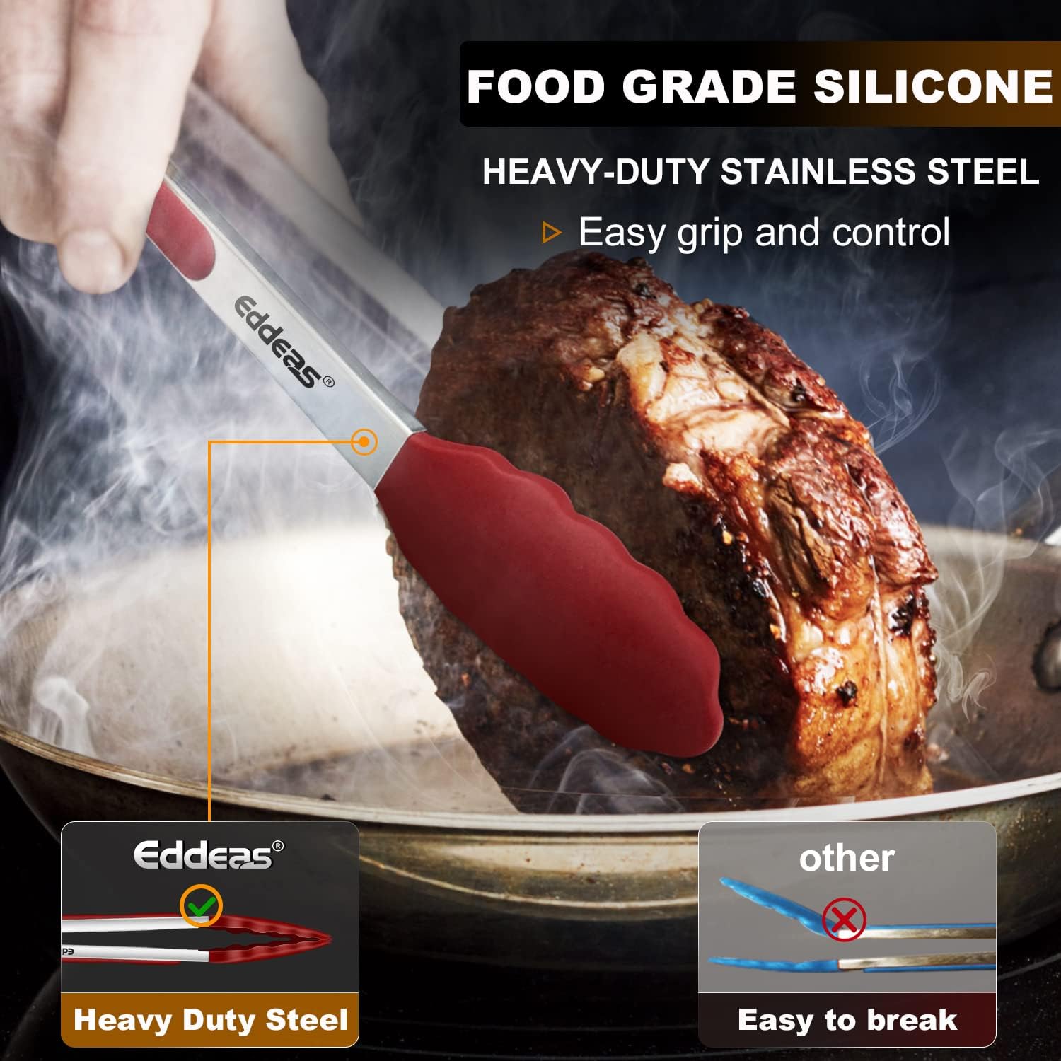 - EDDEAS NON STICK SILICONE TIP, Silicone KitchenTongs for Cooking won't MELT, RUST OR FLAKE-The tip is made of food-grade silicone, which is safety-tested, heat resistant up to 480Β°F . Food tongs with non-stick silicone tips protect your cookware from damage, easy to clean and dishwasher safe.