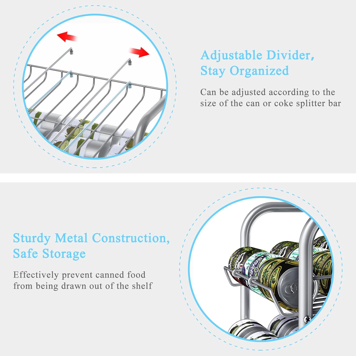 - 【Perfect Size】The can good organizer size is 16.89*12.44*35.35. Each tier comes with 2 adjustable dividers, which can help you sort and manage cans and beverages and keep the storeroom/cabinet/pantry in order.