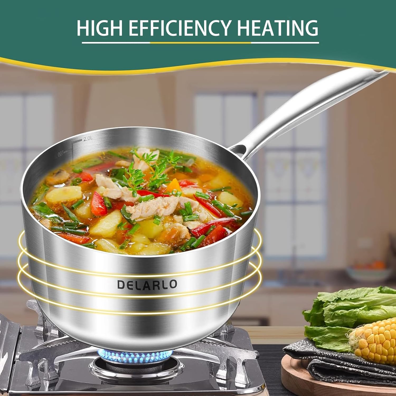 DELARLO Whole Body Tri-Ply Stainless Steel 3 Quart Saucepan with Lid, Oven Safe 600℉, Heavy Duty Saucier Pan 3 Quart, Fast and Even Heat, Kitchen and Dining Sauce Pot, Induction Pot(Lids 300℉)