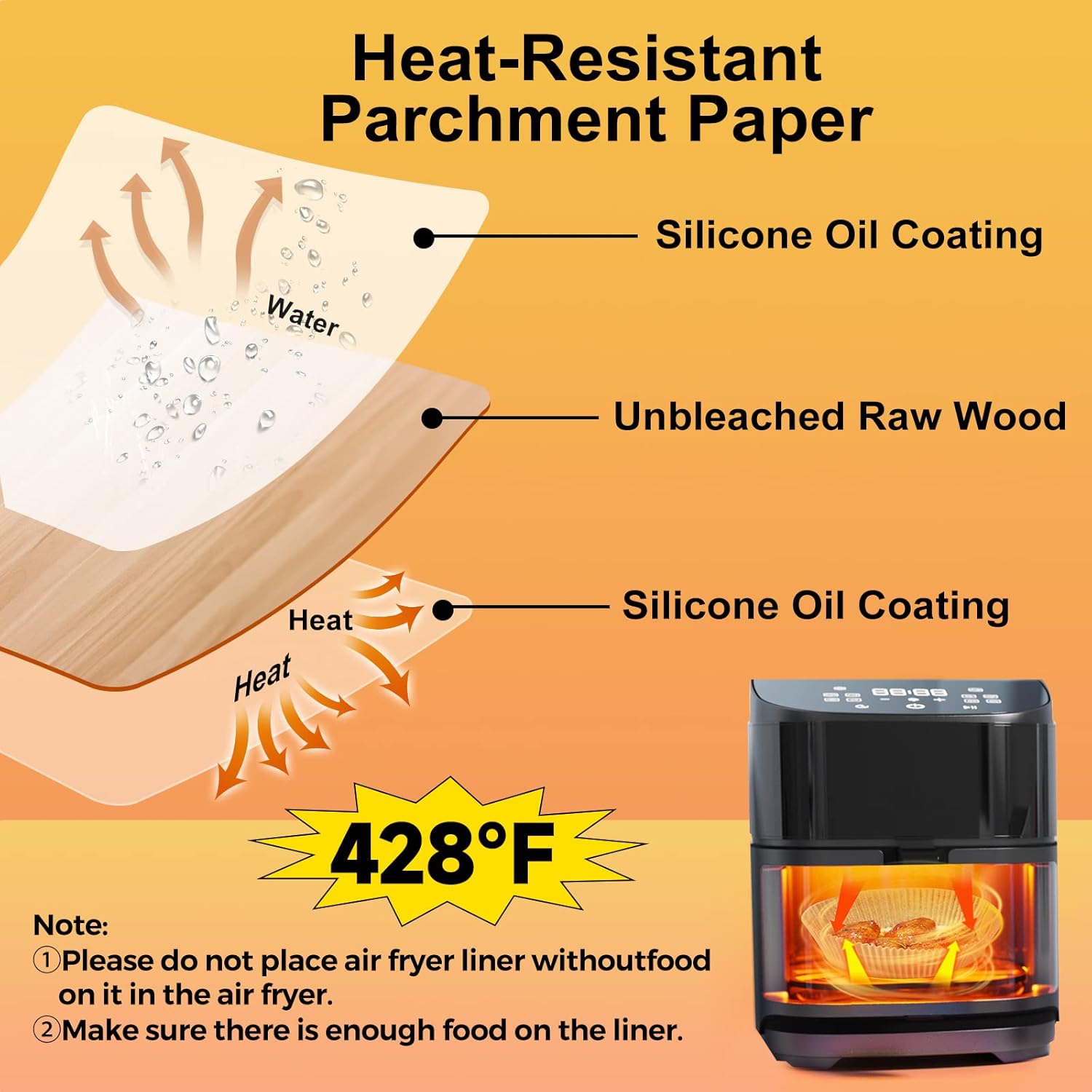 - Reliable Material: The air fryer parchment paper liners is made of food-grade parchment paper, which is oil proof, water proof and non-stick. Baking paper can withstand temperatures up to 428β and it has no effect on the taste of food