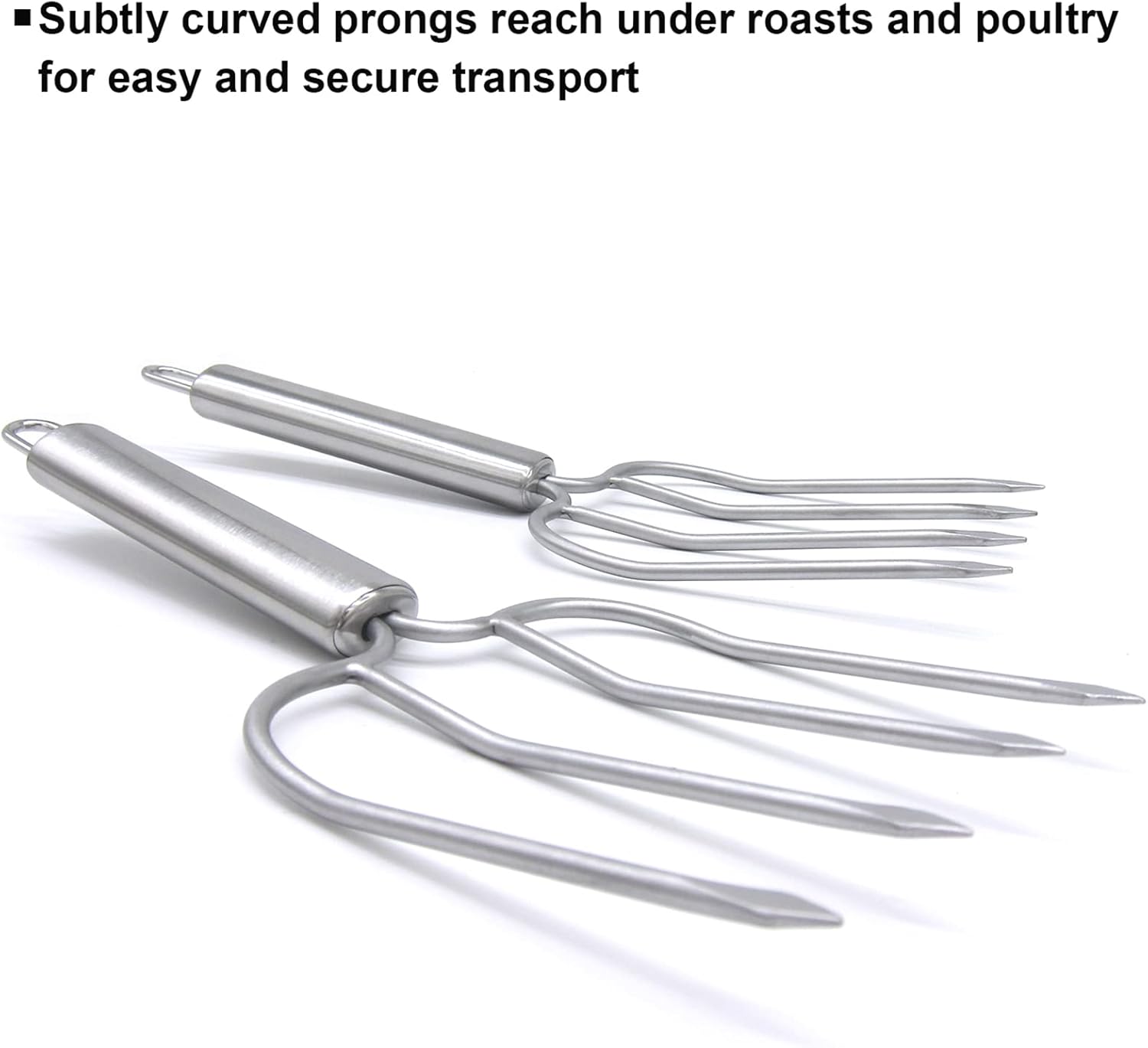 - TURKEY FORKS - Transfer poultry from roasting pan to serving dish in one seamless motion. Crafted of durable stainless steel to support the weight of holiday-size turkeys, ergonomic handles ensure superior balance and optimal comfort. After lifting the main course, use the tools for carving and serving at the table.