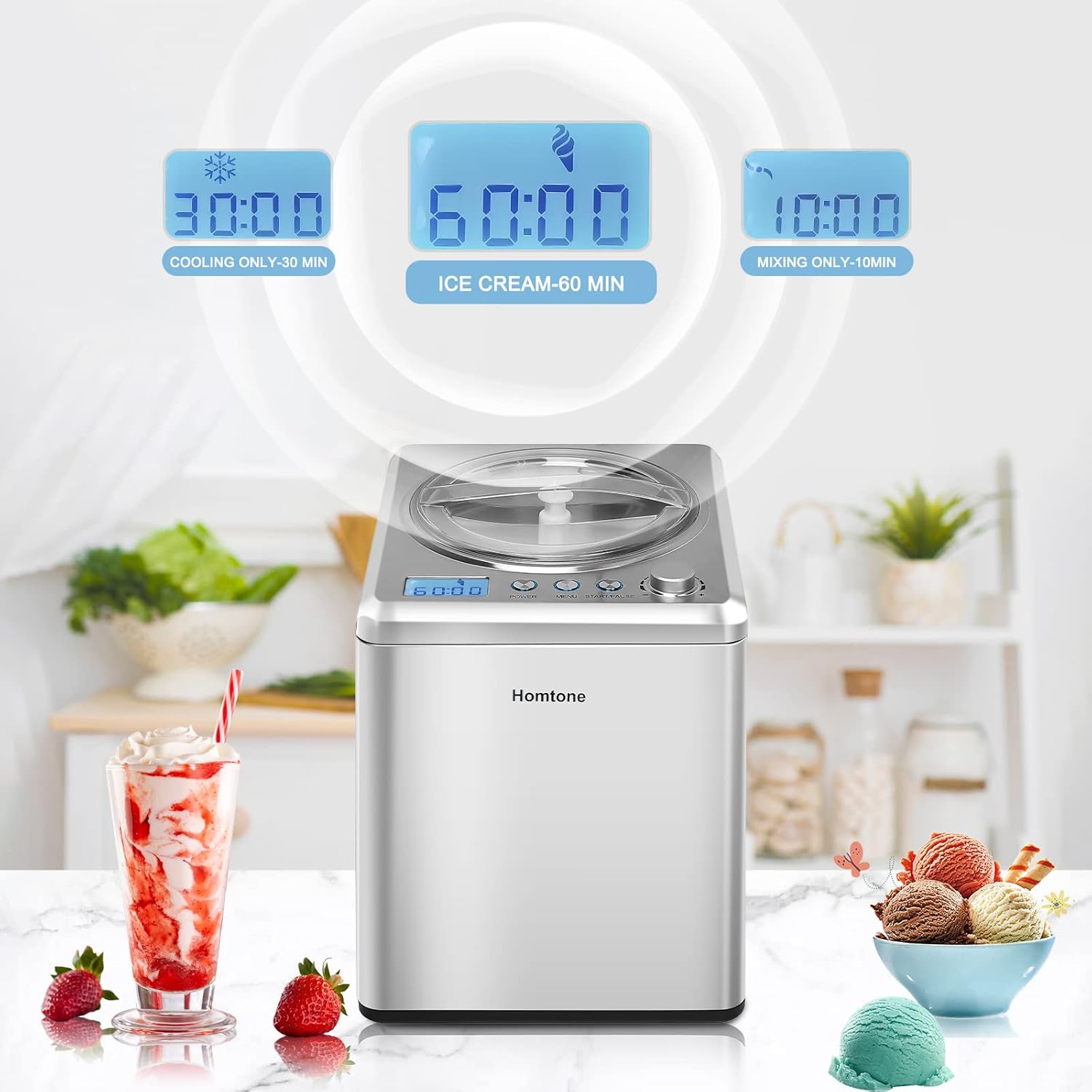 - 【Safe to Use】:Homtone Ice Cream Maker's stainless steel bowl and mixing blades are BPA-free for safe food contact. Homtone Compressor Ice Cream Maker has an extended 2-hour keep-cool time to prevent ice cream from melting and motor protection to prevent overheating and damage.