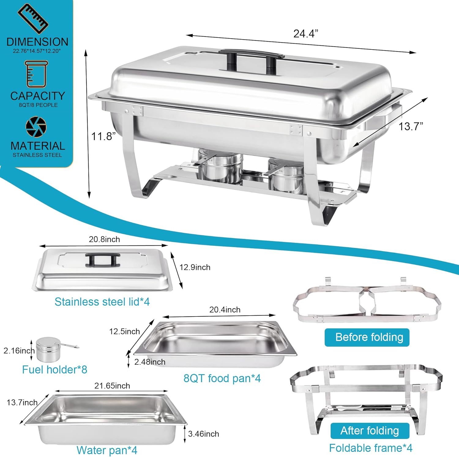 - 【CHAFING DISHES】 - 4 Pack Chafing Dish Buffet Set Chafers 8Q.Each chafing dish comes with 2 fuel holders, frame, small tray, large tray pan tray, and lid. Chafing dish has a Stainless Steel, frame As well as a heavy duty handle that supports its 8 quart tray to ensure that the product can be moved with ease.The flipped edge process greatly reduces the risk of injury from edges and reduces damage during shipment. There are two cool handles for easy movement during use.