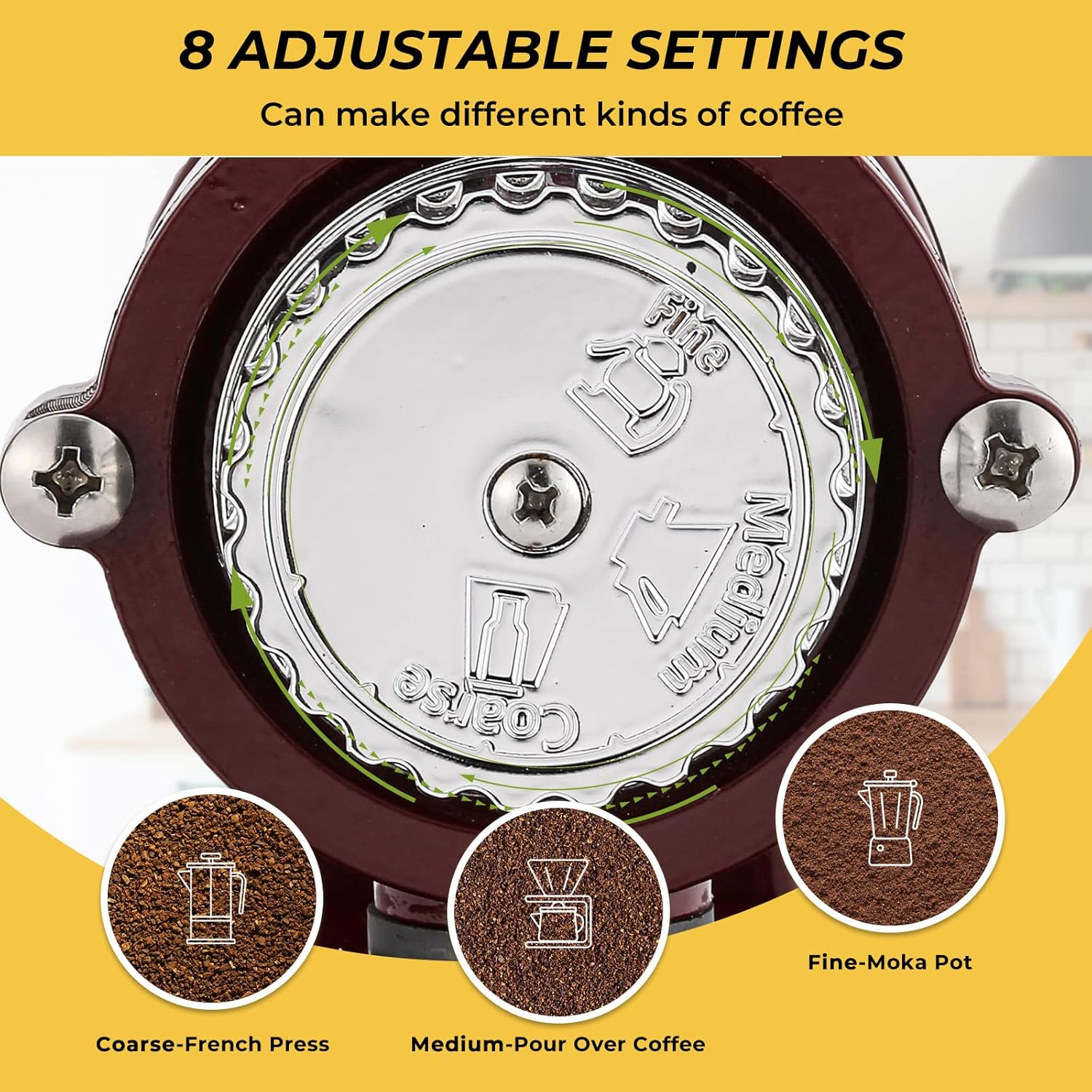 - 8 Grind Settings: You can grind any thickness you want from a very fine espresso coffee(gear 1) to a coarse french press coffee(gear 8). Therefore, this coffee bean grinder is perfect for cold brew, drip coffee, french press, espresso or pour over