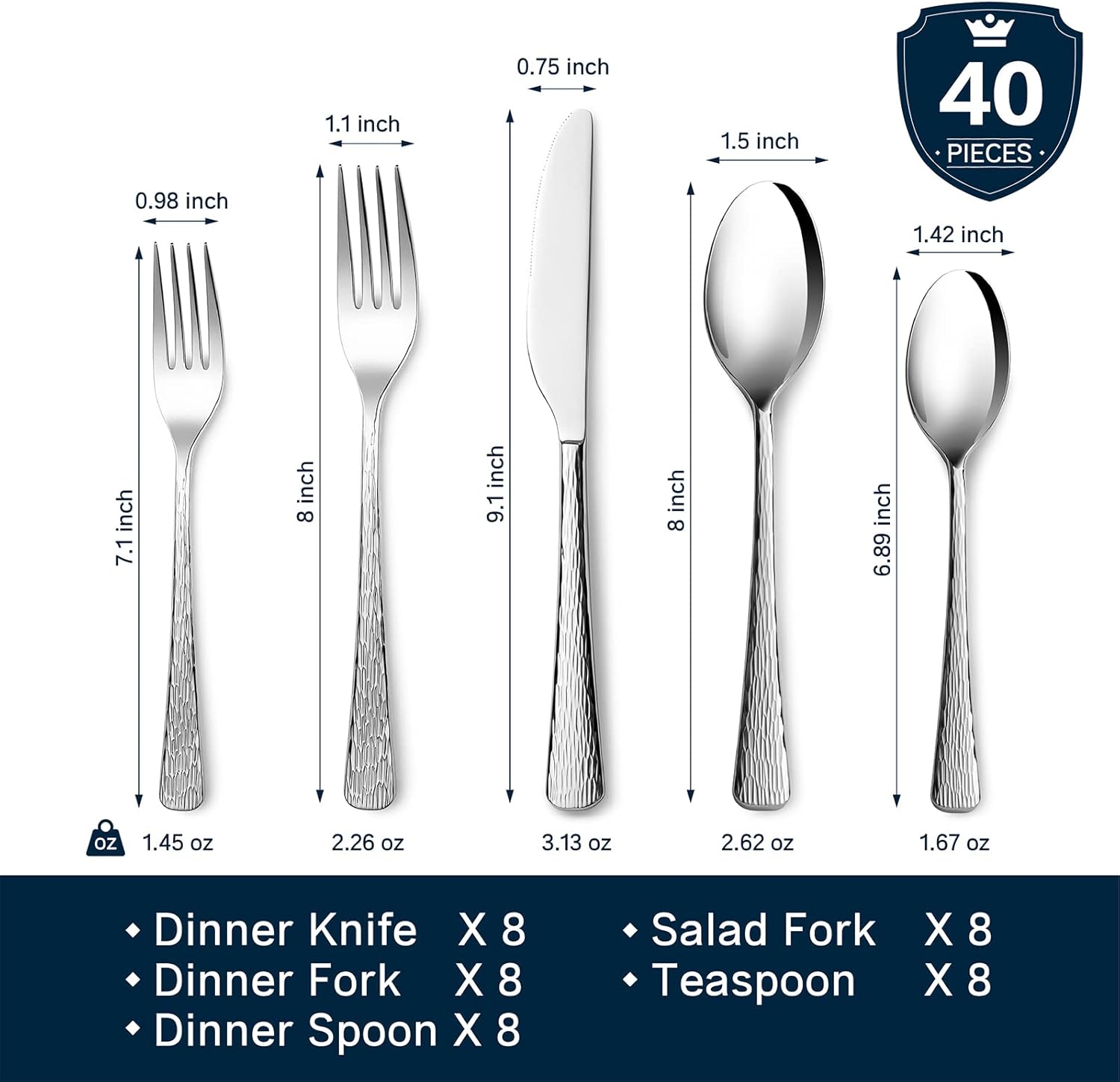 - SILVERWARE SET INCLUDES: 40-piece flatware set includes 8 dinner knife (9.1 inch/3.13 oz), 8 dinner fork (8 inch/2.26 oz), 8 dinner spoon (8 inch/2.62 oz), 8 salad fork (7.1 inch/1.45 oz) and 8 teaspoon (6.89 inch/1.67 oz), service for 8