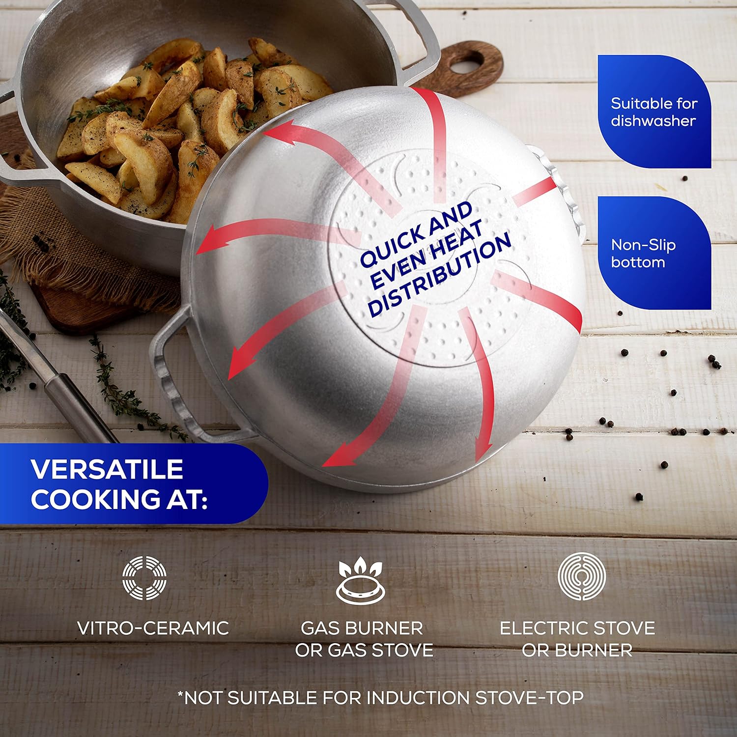 - β Durable & Efficient Cast Aluminum Caldero β Perfect for Everyday Cooking: Designed for home kitchens, this lightweight yet ultra-resistant 6.3 QT caldero ensures even, rapid heating, allowing you to prepare meals faster and more efficiently. The premium stainless cast aluminum construction helps retain flavors, ensuring that every dish is cooked to perfection. Plus, itβs easy to clean and wonβt absorb odors or alter the taste of your food.