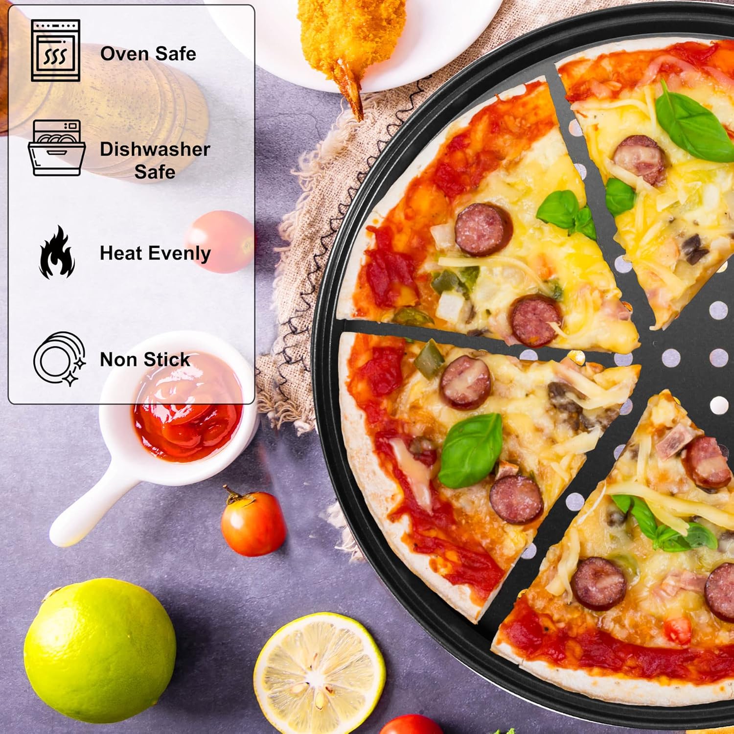 - Multifuction: These black pizza pan is good for cake,baking pastry,sandwiches,bacon,suitable for home kitchen,restaurant,hotel. Our round pizza bakeware is ideal for baking homemade pizza,crisper and bread. The baking tray can help you make delicious food with your family and friends.