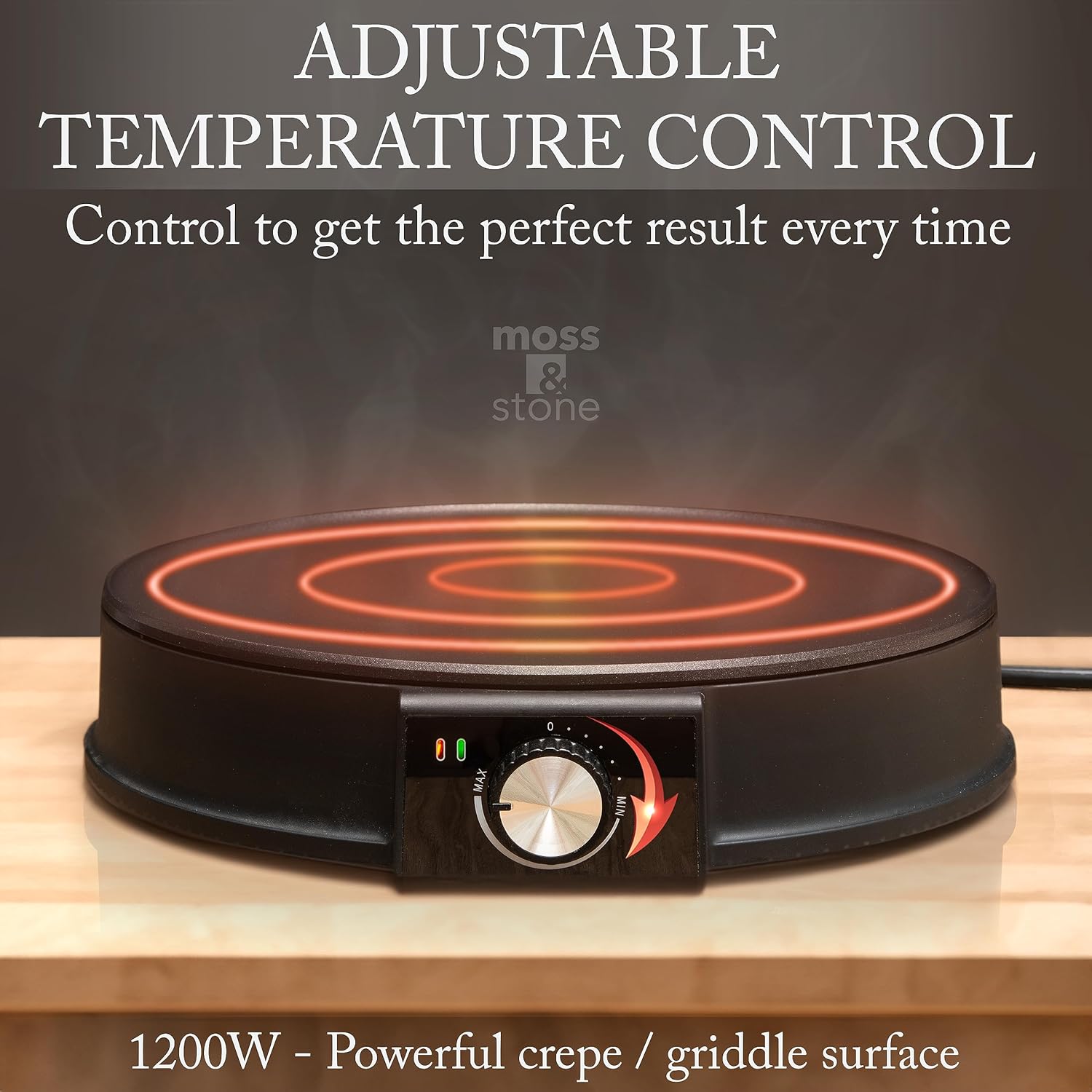 Moss & Stone 12 Inch Electric Griddle & Crepe Maker Machine. Electric Crepe Maker with Adjustable Temperature for Blintzes Pancakes & Tortilla, Non-Stick Crepe Pan & Batter Spreader & Spatula